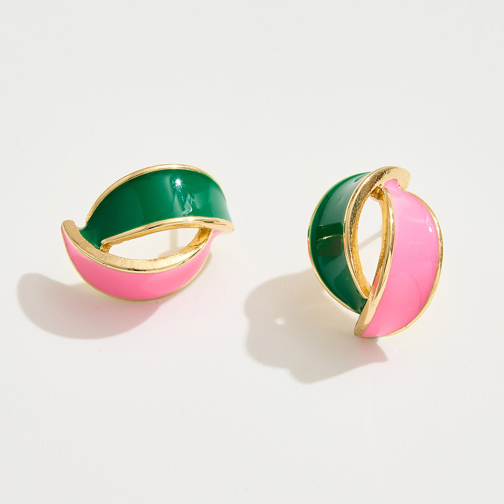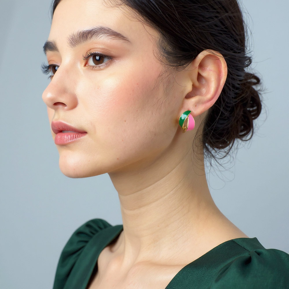 Details • Size : 0.6" X 0.8" • Post Back • Stylish and versatile, these enamel twist hoop earrings feature a two-tone design with a modern sculptural finish. Their compact size makes them perfect for everyday wear while adding a chic pop of color to elevate casual and dressy looks alike. • Brass • Gold Dipped • Hypoallergenic • Lead and Nickel Compliant • Made In Korea