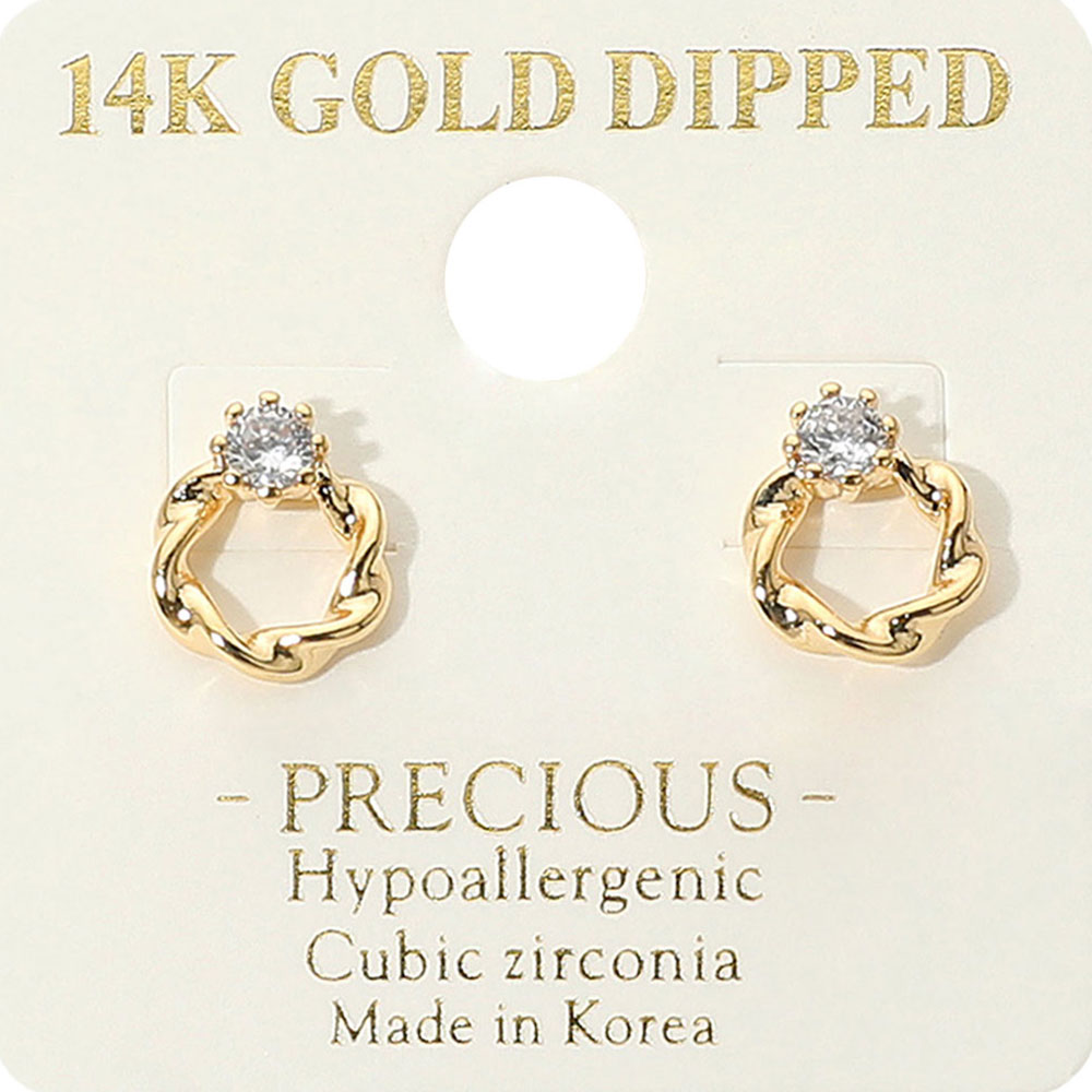Details • Size : 0.3" X 0.4" • Post Back • Discover these elegant twisted knot stud earrings adorned with dazzling accent stones. A perfect accessory for adding a refined and stylish touch to any outfit, ideal for both everyday wear and special occasions. • CZ Cubic Zirconia • Gold Dipped • Hypoallergenic • Made In Korea