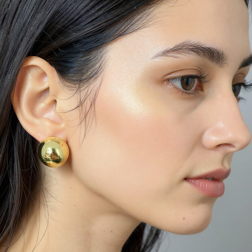 Details • Size : 0.8" X 0.8" • Post Back • Sleek and modern, these round dome stud earrings bring a polished finish to any look. Their smooth, reflective surface makes them versatile for both casual wear and formal occasions, offering a timeless accessory that adds elegance and sophistication with ease. • Lead and Nickel Compliant • Made In Korea • Gold Dipped • Brass