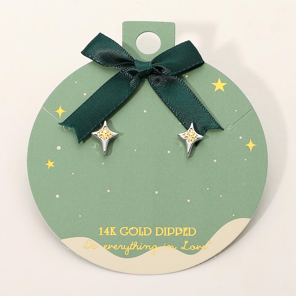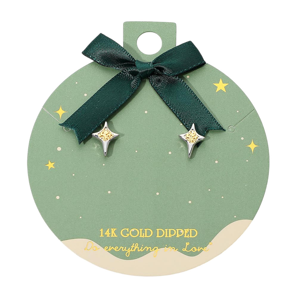 Details • Size : 0.4" X 0.5" • Post Back • Chic starburst stud earrings featuring a sculpted four-point design with a textured center for added shine. Their playful yet elegant silhouette makes them perfect for gifting, seasonal outfits, festive looks, or adding a subtle celestial accent to everyday style. A charming, versatile accessory. • Gold Dipped • Hypoallergenic • Lead and Nickel Compliant • Made In Korea