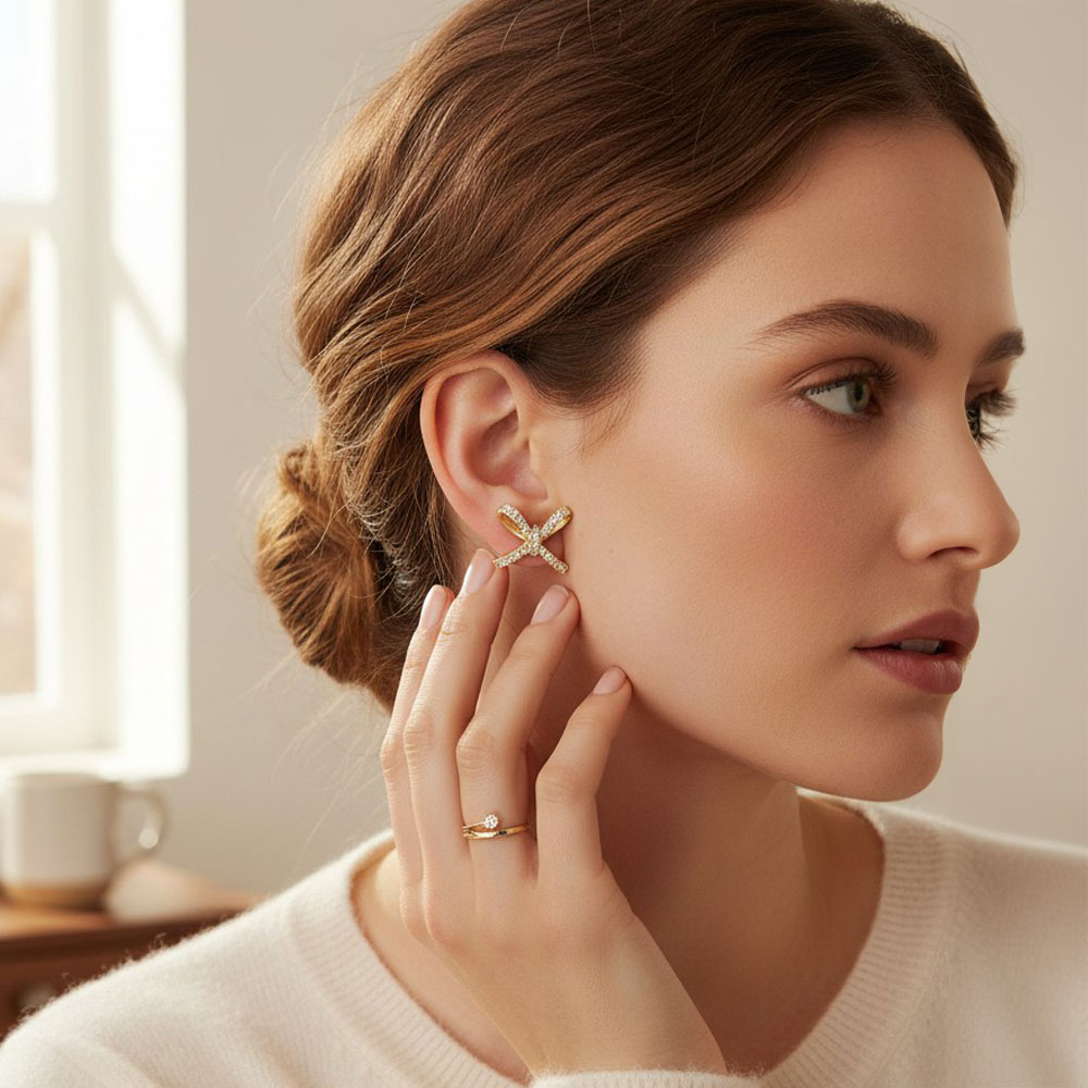 • Elegant bow-shaped stud earrings detailed with shimmering pavĂ© accents for refined sparkle and modern charm. Designed to elevate everyday outfits or complement evening ensembles, these lightweight studs offer graceful shine and a timeless statement perfect for both casual wear and special occasions.