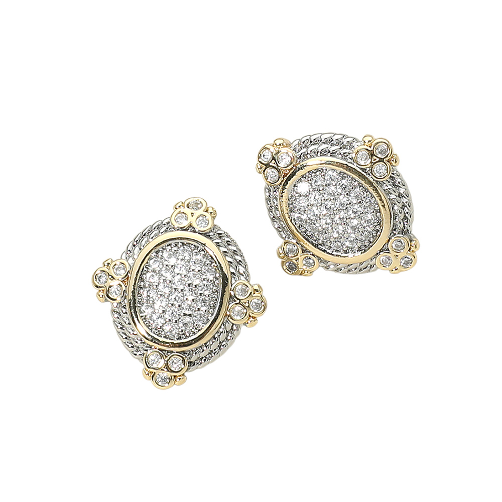 14K Gold Plated Two Tone CZ Pave Oval Stud Earrings