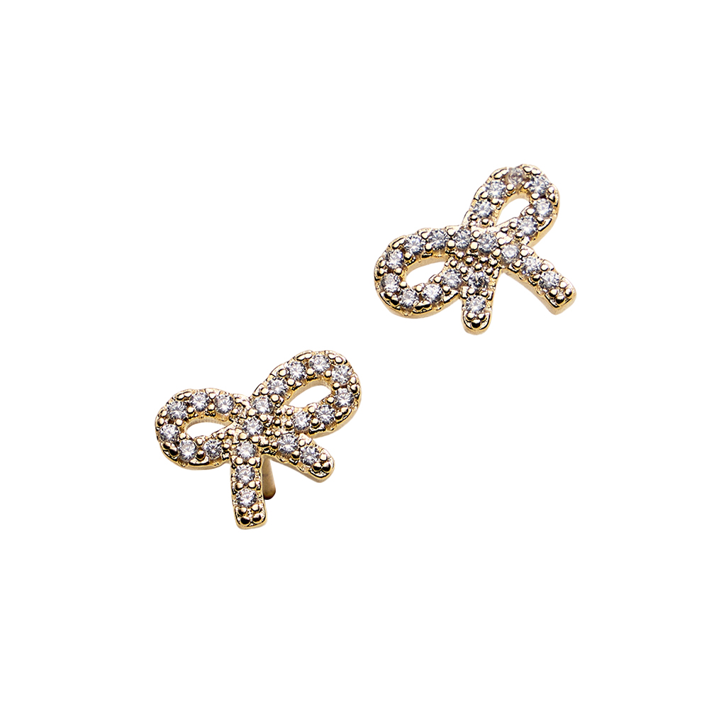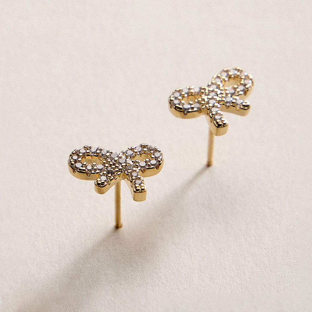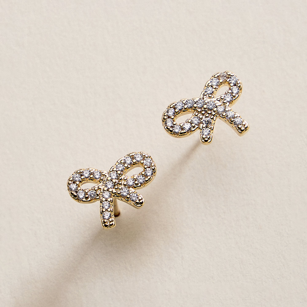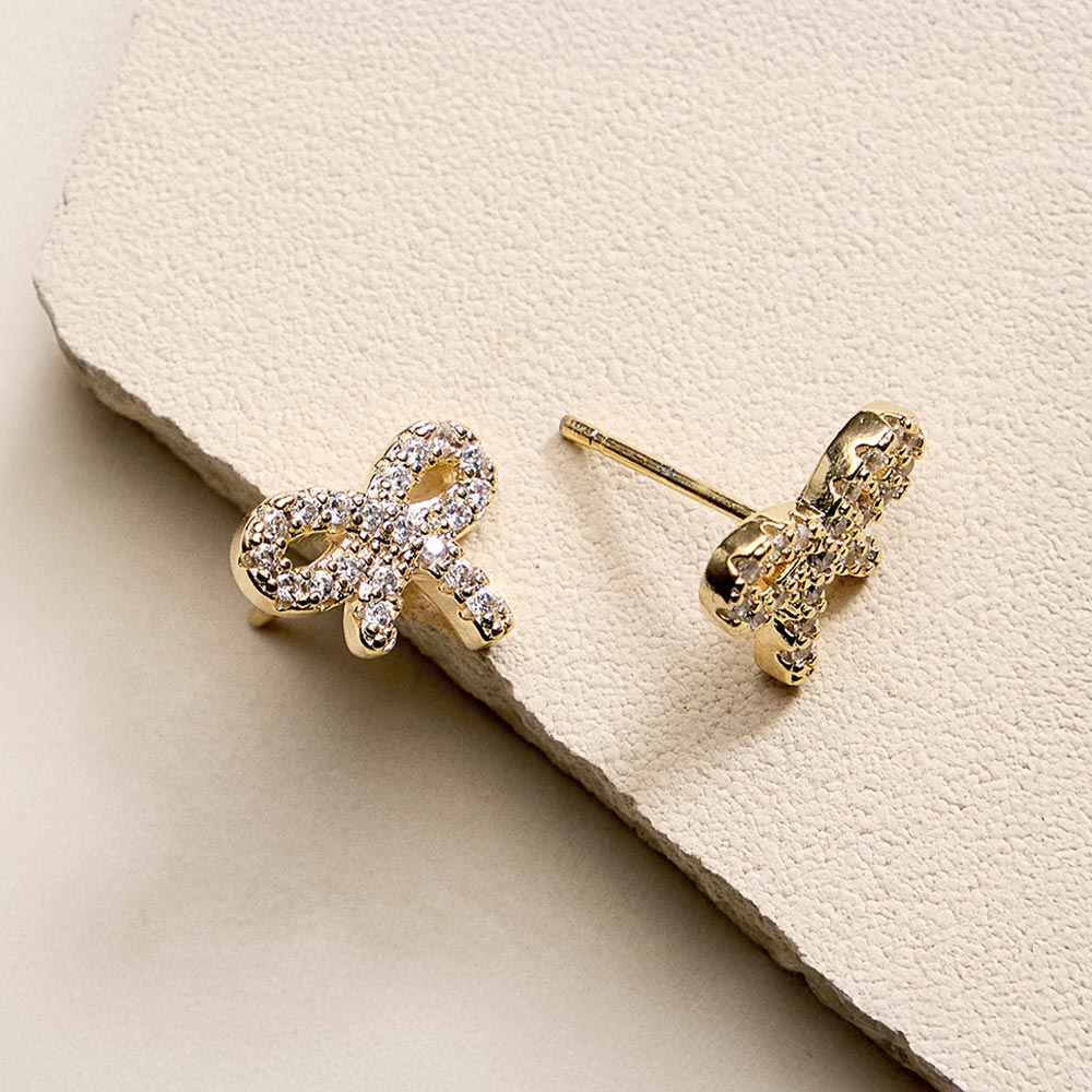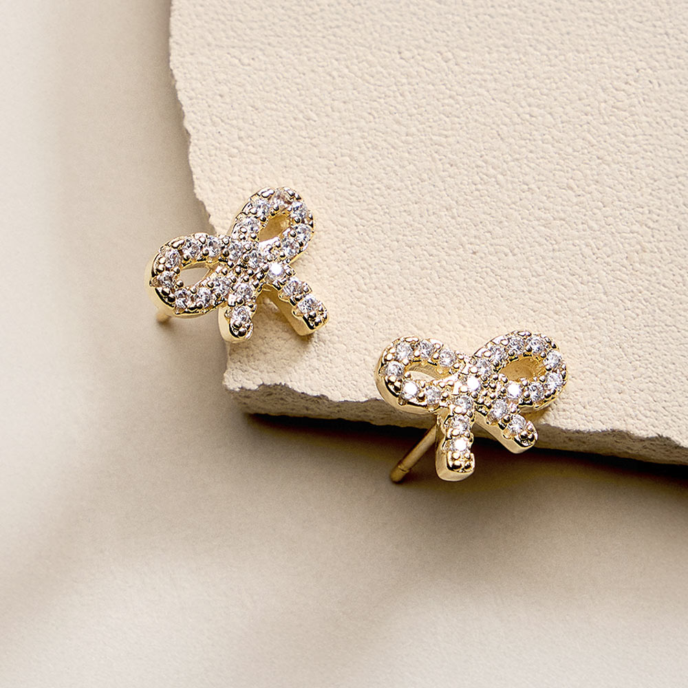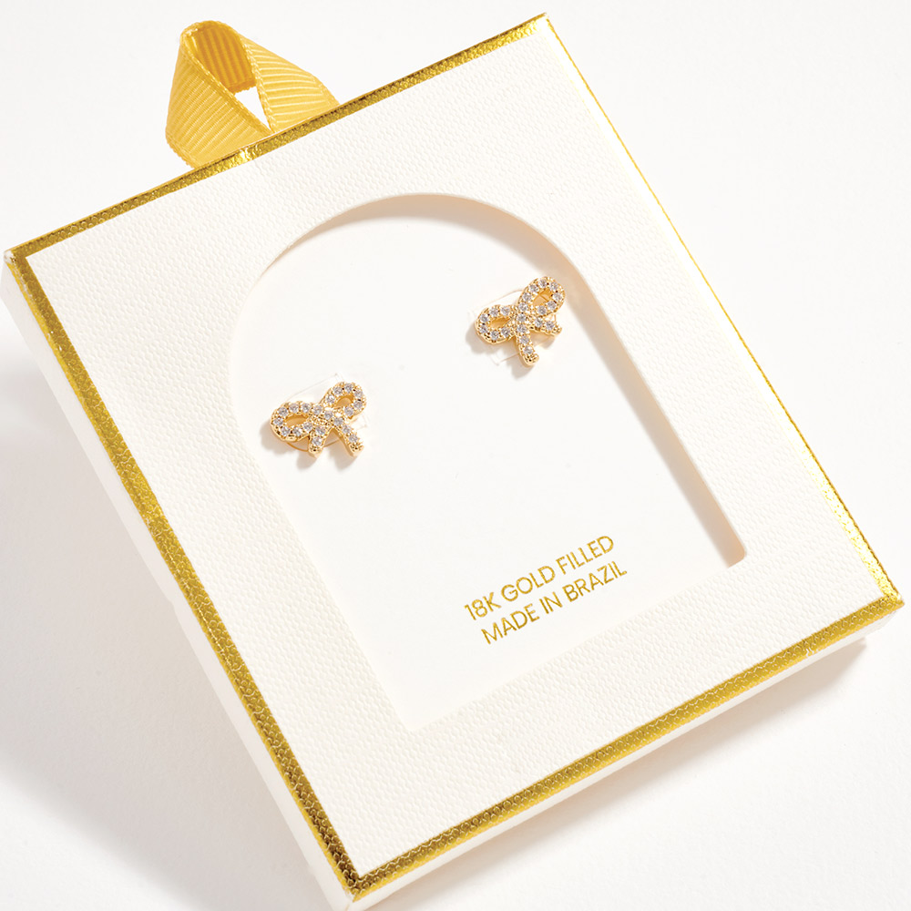 Details • Size : 0.5" X 0.3" • Post Back • Delicate bow stud earrings accented with sparkling CZ stones for a sweet yet polished look. The petite silhouette adds subtle shine without overpowering, making them perfect for everyday wear, gifting, or layering with other studs. A timeless design that feels charming and refined. • CZ Cubic Zirconia • Gold Filled • Hypoallergenic • Lead and Nickel Compliant • Made In Brazil