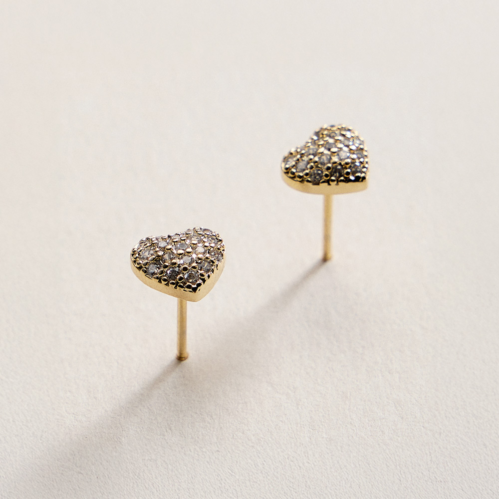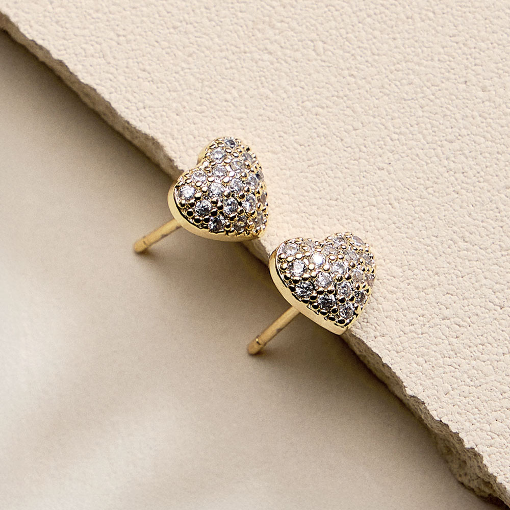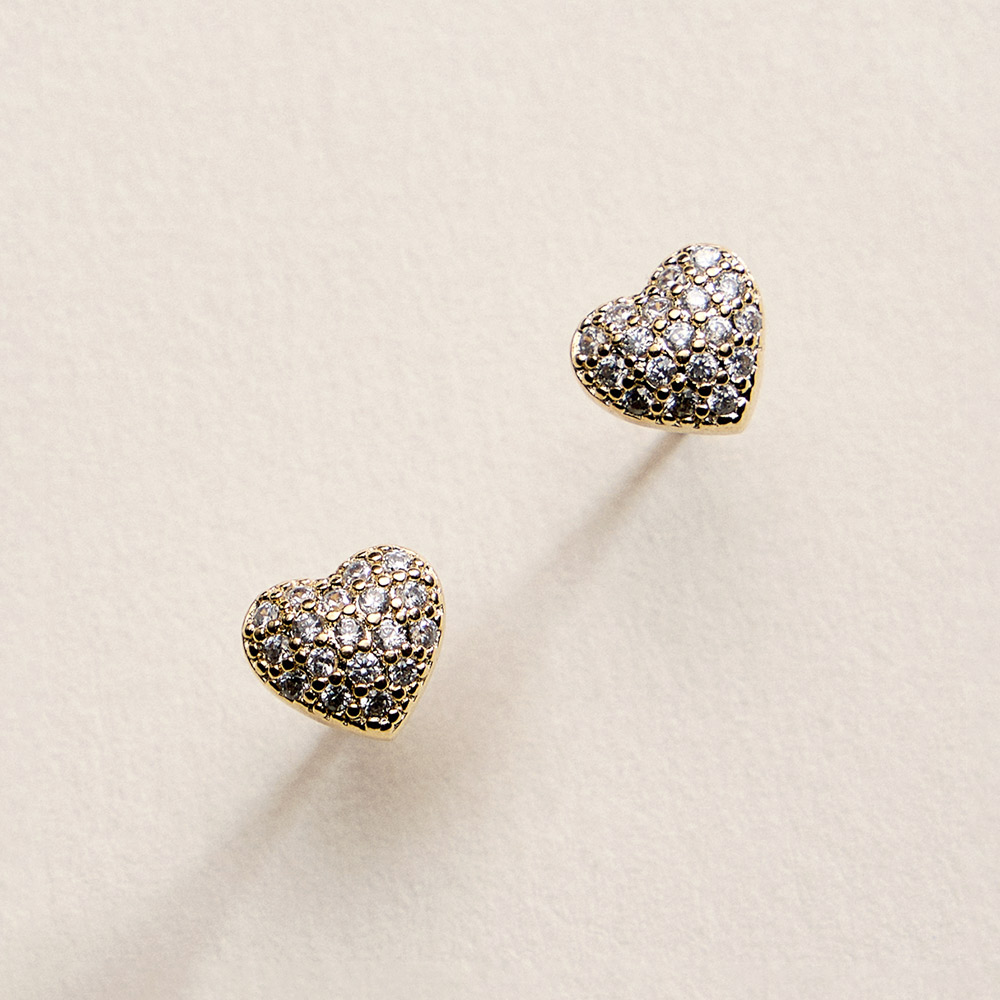 • Sweet heart-shaped stud earrings featuring a pavĂ© CZ design that adds soft sparkle and romantic charm. Perfect for everyday wear, gifting, or special moments, these studs offer a timeless silhouette that pairs easily with casual looks or layered earring styles.