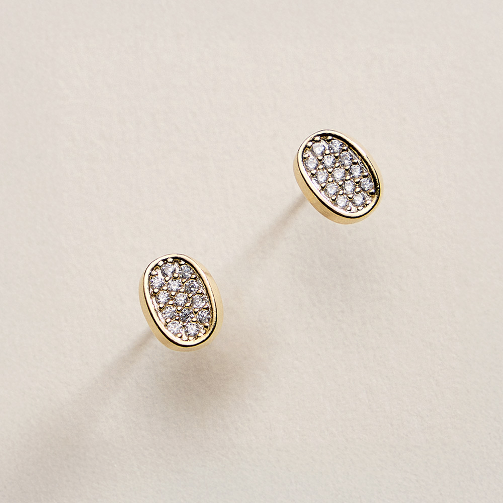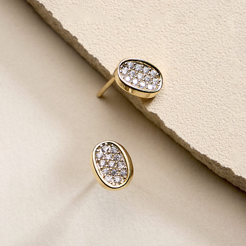 • Elegant oval stud earrings accented with shimmering pavĂ© CZ stones for refined everyday sparkle. Designed with a smooth, compact silhouette that sits comfortably on the ear, these versatile studs are perfect for daily wear, gifting, layering, or adding a polished touch to any look.