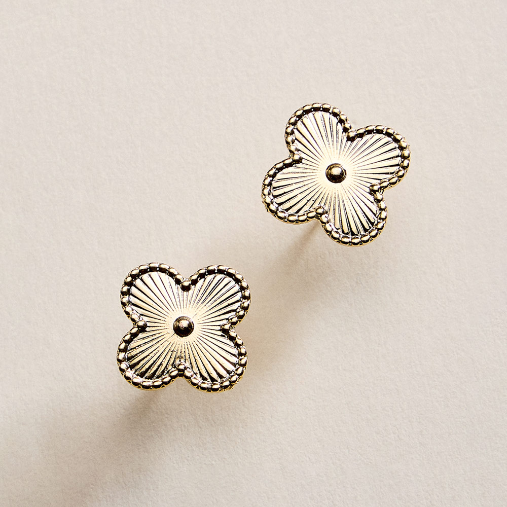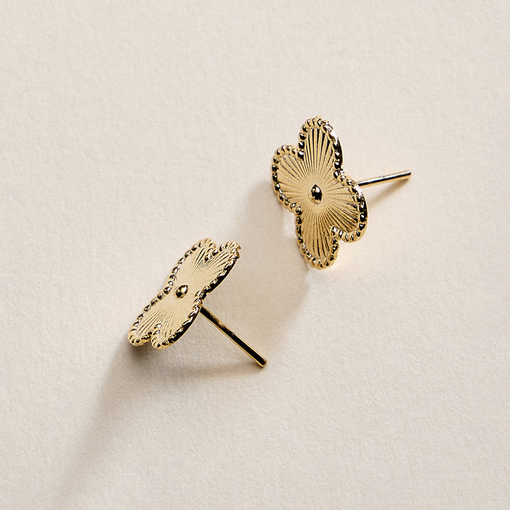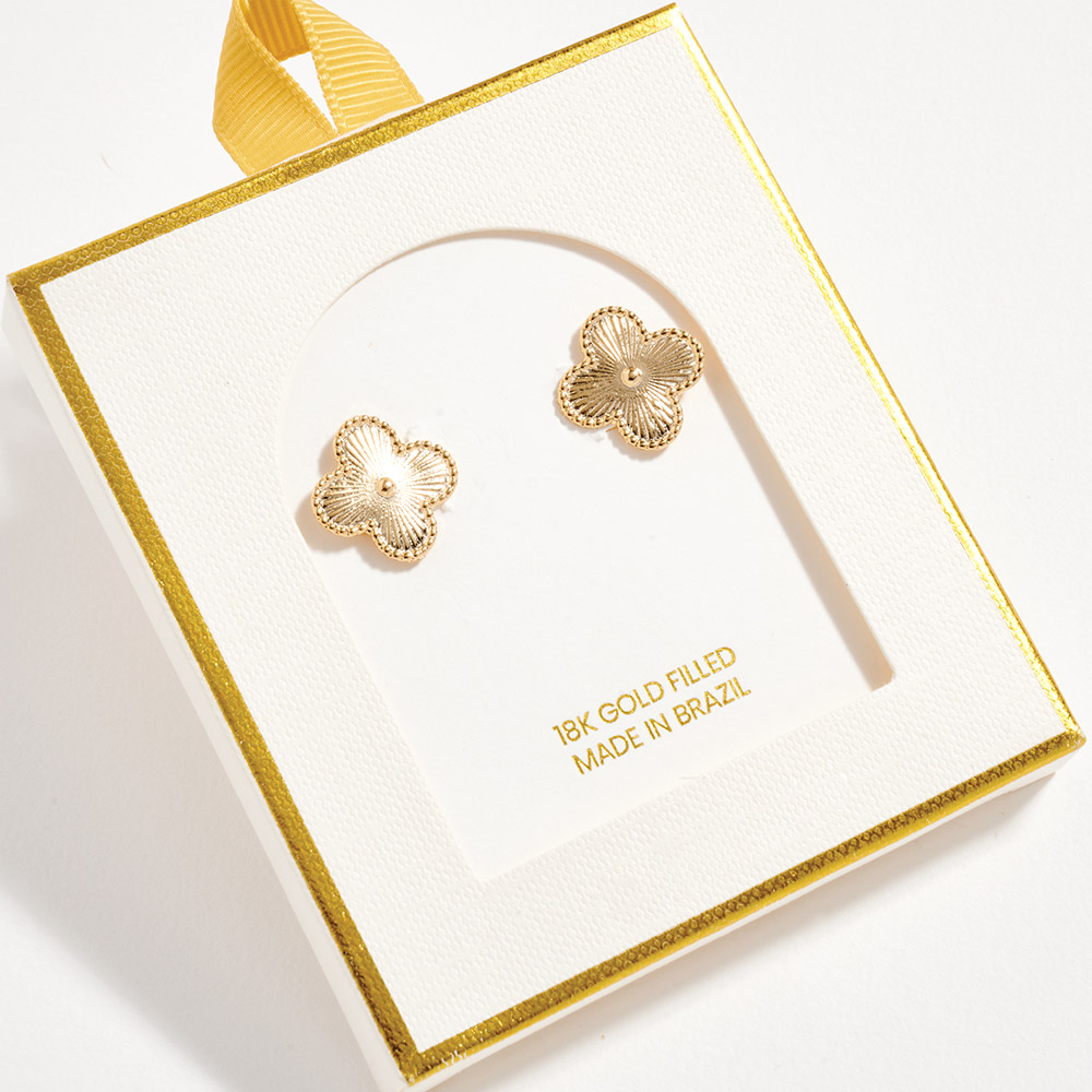 Details • Size : 0.7" X 0.7" • Post Back • Charming quatrefoil stud earrings featuring a delicate petal-inspired design with refined texture and a balanced silhouette. Perfect for daily wear or special occasions, these studs add a soft, elegant accent to any outfit and make a timeless gift for birthdays, holidays, or meaningful moments. • Gold Filled • Hypoallergenic • Lead and Nickel Compliant • Made In Brazil