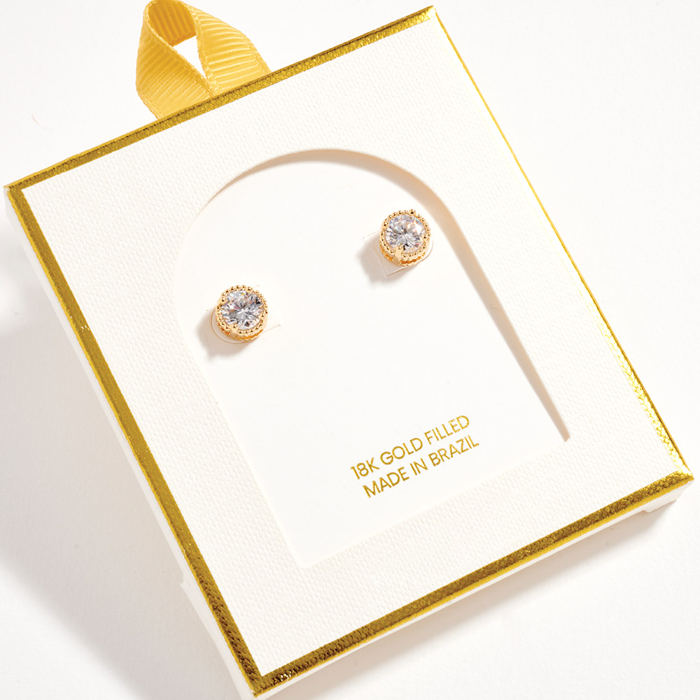 Details • Size : 0.3" X 0.3" • Post Back • Classic round stud earrings designed with a halo-inspired silhouette for added brilliance and dimension. A timeless accessory that pairs effortlessly with casual, work, or evening looks, offering polished sparkle and everyday versatility for any jewelry collection. • CZ Cubic Zirconia • Gold Filled • Hypoallergenic • Lead and Nickel Compliant • Made In Brazil