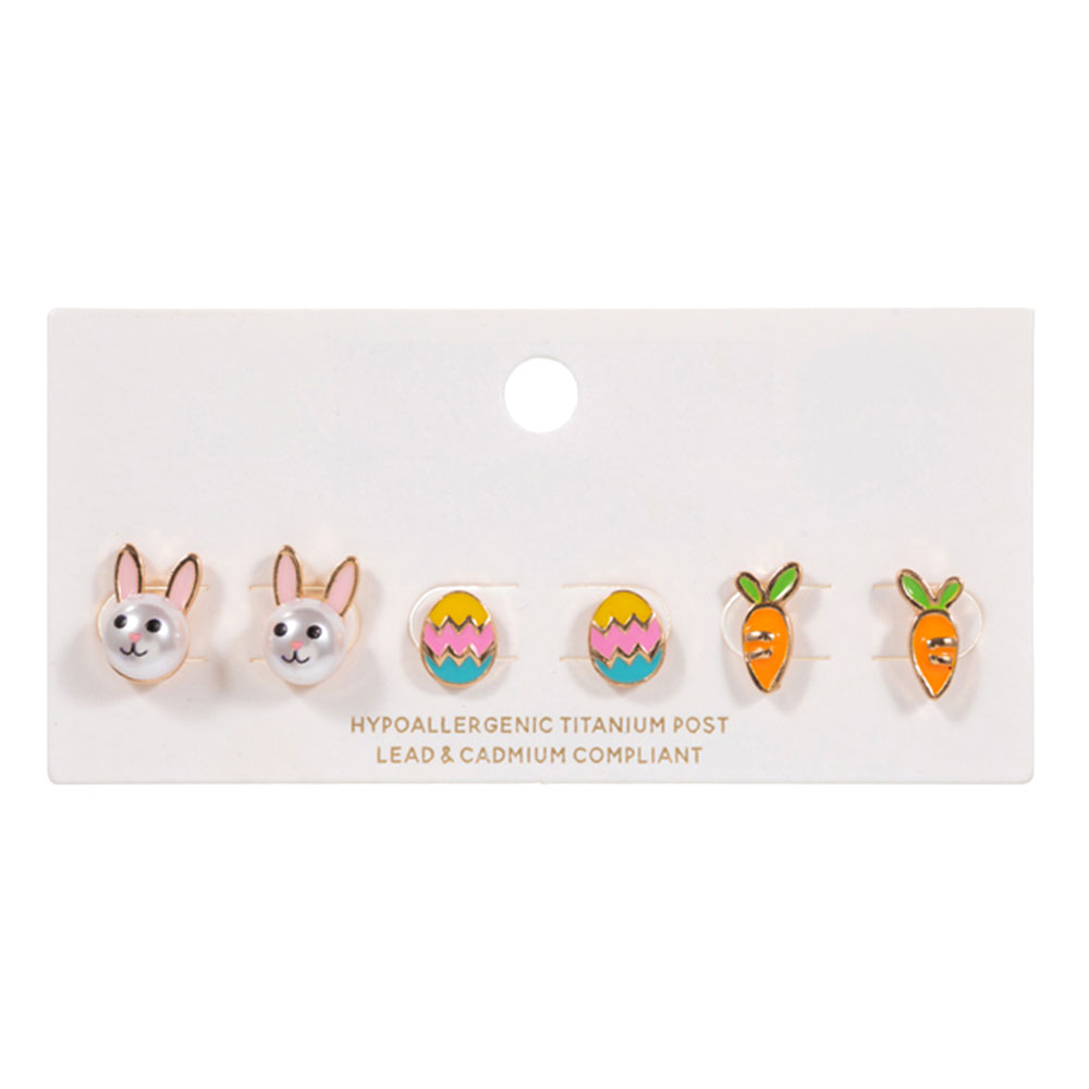 Details • Size : 0.3" - 0.5" L • Titanium Post Back • This Easter-themed stud earring trio features playful seasonal icons in a compact, easy-to-style design. Perfect for mixing and matching, gift displays, and spring assortments, this set adds a cheerful touch to everyday looks while appealing to customers seeking festive, lightweight accessories. • Hypoallergenic • Lead and Nickel Compliant