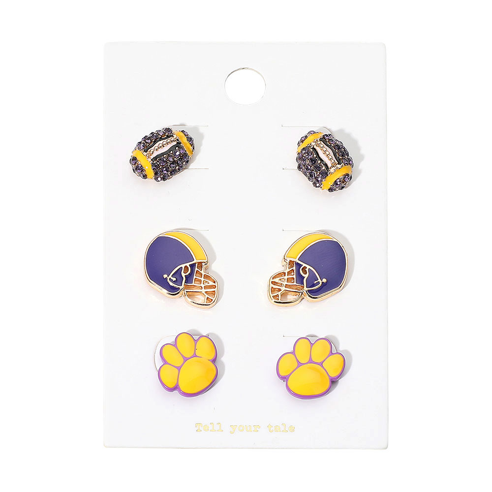 3Pairs - Game Day Spirit Ball Helmet Paw Stud Earring Set