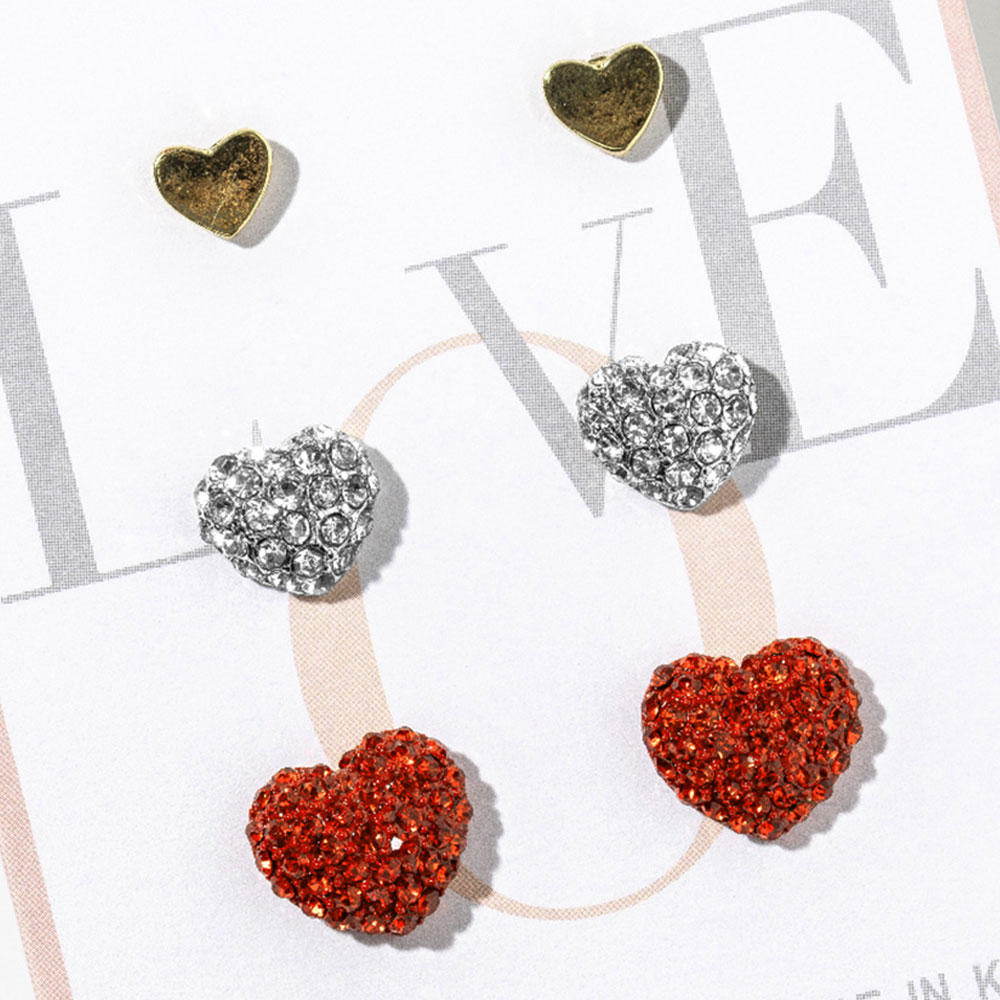 • Heart stud earring trio set designed for easy mix and match styling. Features three heart-shaped stud designs in coordinated sizes, perfect for multiple piercings or versatile everyday wear. A charming, gift-ready accessory ideal for boutiques, seasonal assortments, and customers seeking playful yet timeless heart jewelry.
