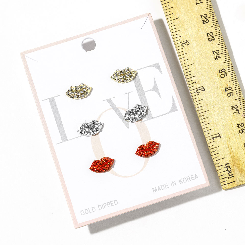 3Pairs - Gold Dipped Rhinestone Studded Mini Lips Stud Earring Set