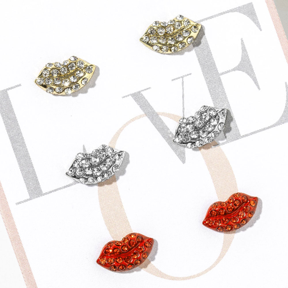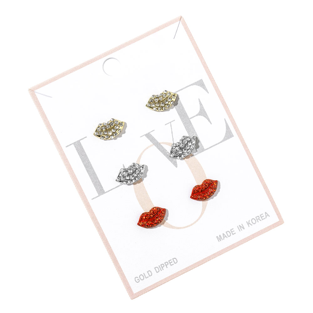 • Lip stud earring trio set designed for playful mix and match styling. Features three coordinating lip shaped stud designs that add a bold, flirty accent to everyday looks. Ideal for multiple piercings, gifting, or trend focused displays, offering a fun statement piece for curated accessory collections and seasonal fashion edits.