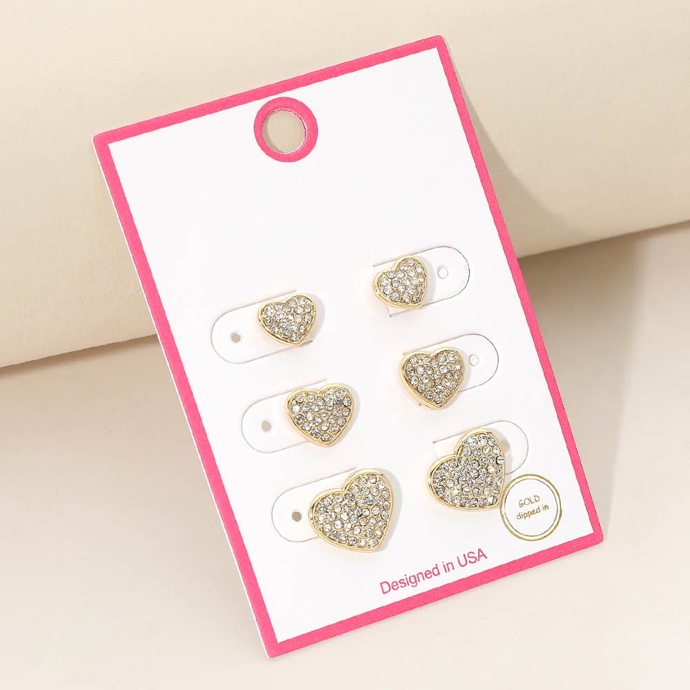 3Pairs - Gold Dipped Stone Pave Heart Stud Earring Set 3Pairs - Gold Dipped Stone Pave Heart Stud Earring Set