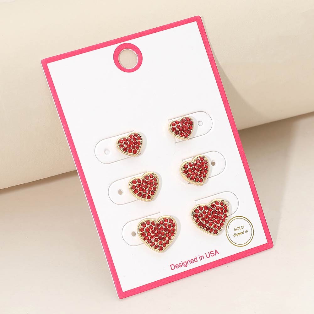 Details • Size : 0.3" - 0.5" L • Post Back • This heart stud earring set features multiple heart-shaped designs accented with shimmering crystal details for a clean, polished look. Ideal for everyday wear, gifting, or boutique assortments, these versatile stud earrings allow easy mixing and matching to complement casual outfits, dressy styles, and special occasion looks. • Lead and Nickel Compliant • Gold Dipped