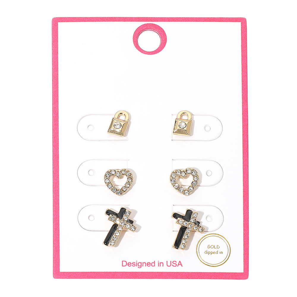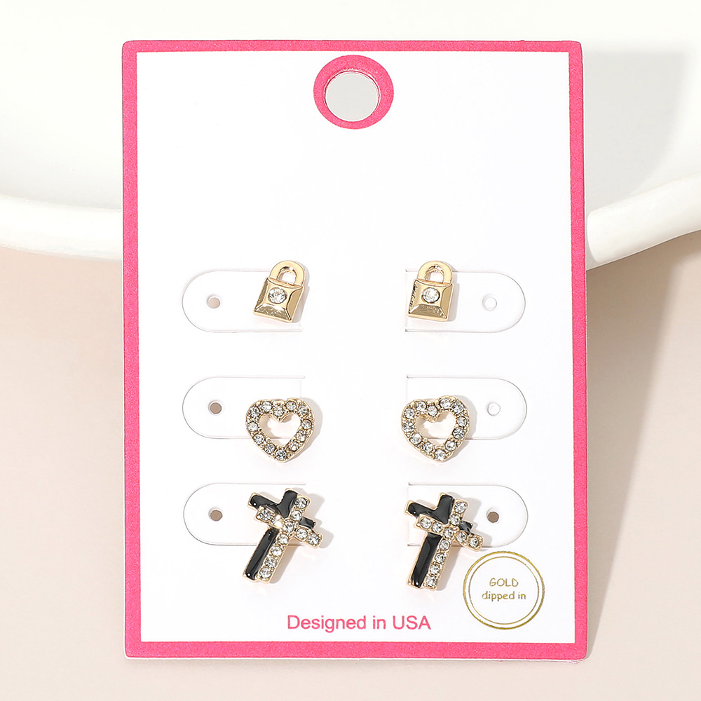 Details • Size : 0.3" - 0.5" L • Post Back • Stud earring set featuring lock, heart, and cross designs for versatile everyday wear. A coordinated multi pair set ideal for gifting, faith inspired styling, and boutique displays. Perfect for mixing and matching, stacking looks, or wearing individually for meaningful and trend focused accessory styling. • Lead and Nickel Compliant • Gold Dipped