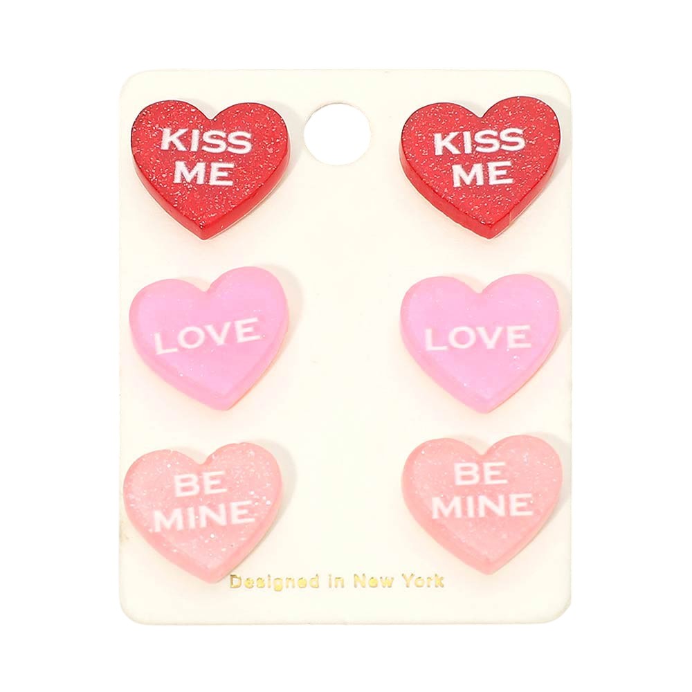 3Pairs - KISS ME LOVE BE MINE Heart Stud Earring Set