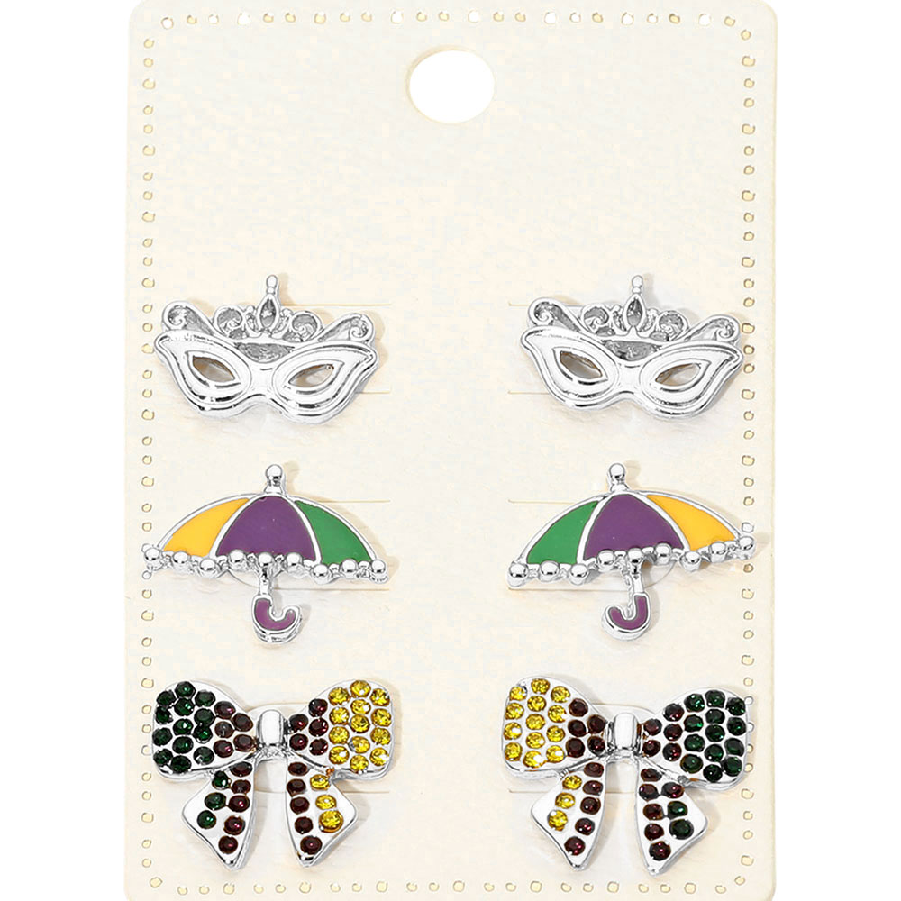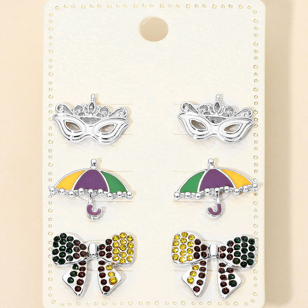 3Pairs - Mardi Gras Mask Umbrella Bow Stud Earring Set