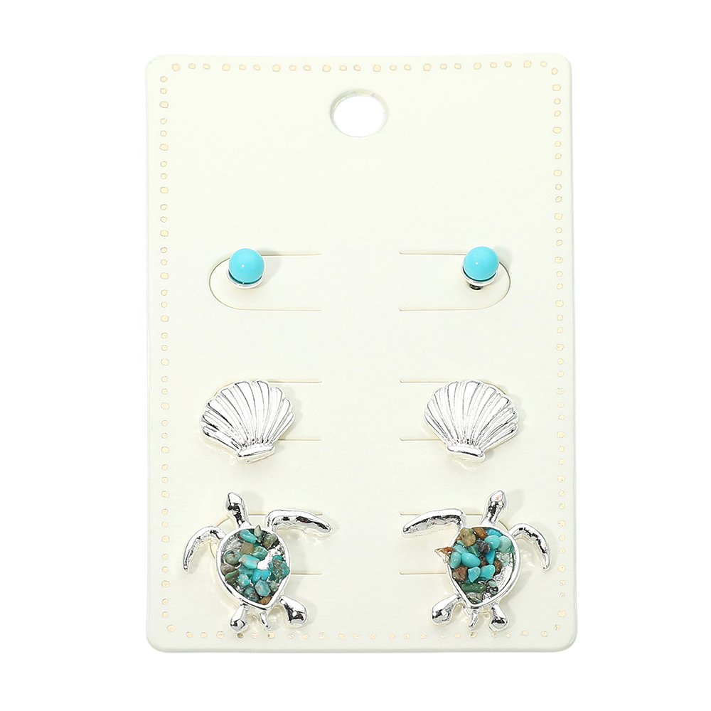 Details • Size : 0.1" - 0.75" L • Post Back • Three-pair sea life inspired stud earring set featuring minimalist round studs, sculpted shell designs, and detailed turtle motifs. Designed for easy mix-and-match styling, this versatile set works for everyday wear, beach themes, travel looks, and seasonal collections. A charming accessory choice for gift shops, coastal displays, and casual jewelry assortments. • Lead and Nickel Compliant