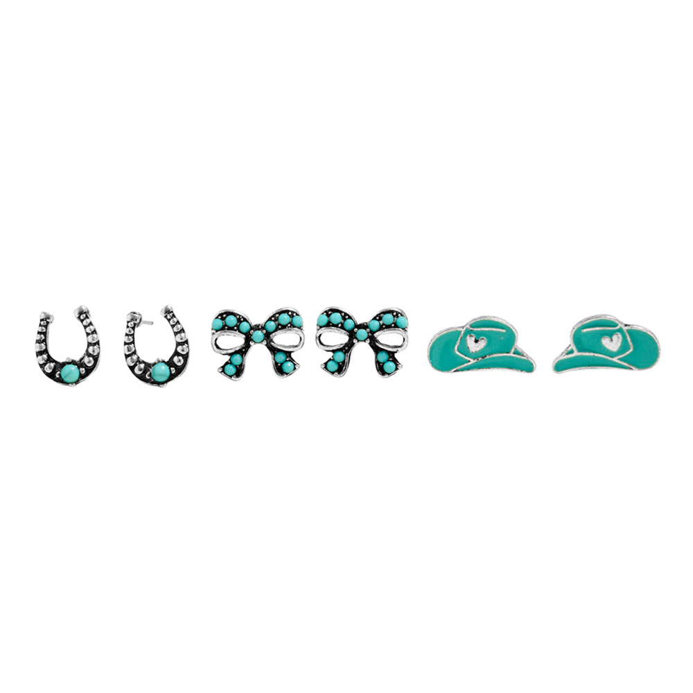Details • Size : 0.5" - 0.7" L • Titanium Post Back • Three-piece western-inspired stud earring set featuring classic motifs for easy mix-and-match styling. Perfect for everyday wear, festivals, and gift giving, offering versatile looks from subtle accents to standout statement combinations in one convenient coordinated collection. • Lead and Nickel Compliant