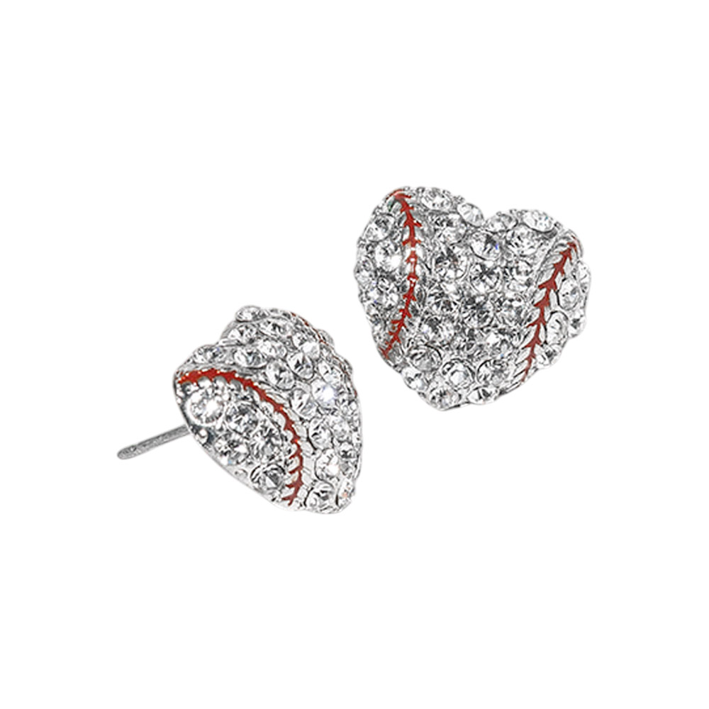 Details • Size : 0.7" X 0.8" • Post Back • Playful heart-shaped stud earrings inspired by classic baseball details, featuring a sparkling crystal-covered surface for eye-catching shine. A fun statement accessory perfect for sports fans, game day outfits, themed collections, and novelty jewelry displays with a bold, fashionable twist. • Lead and Nickel Compliant