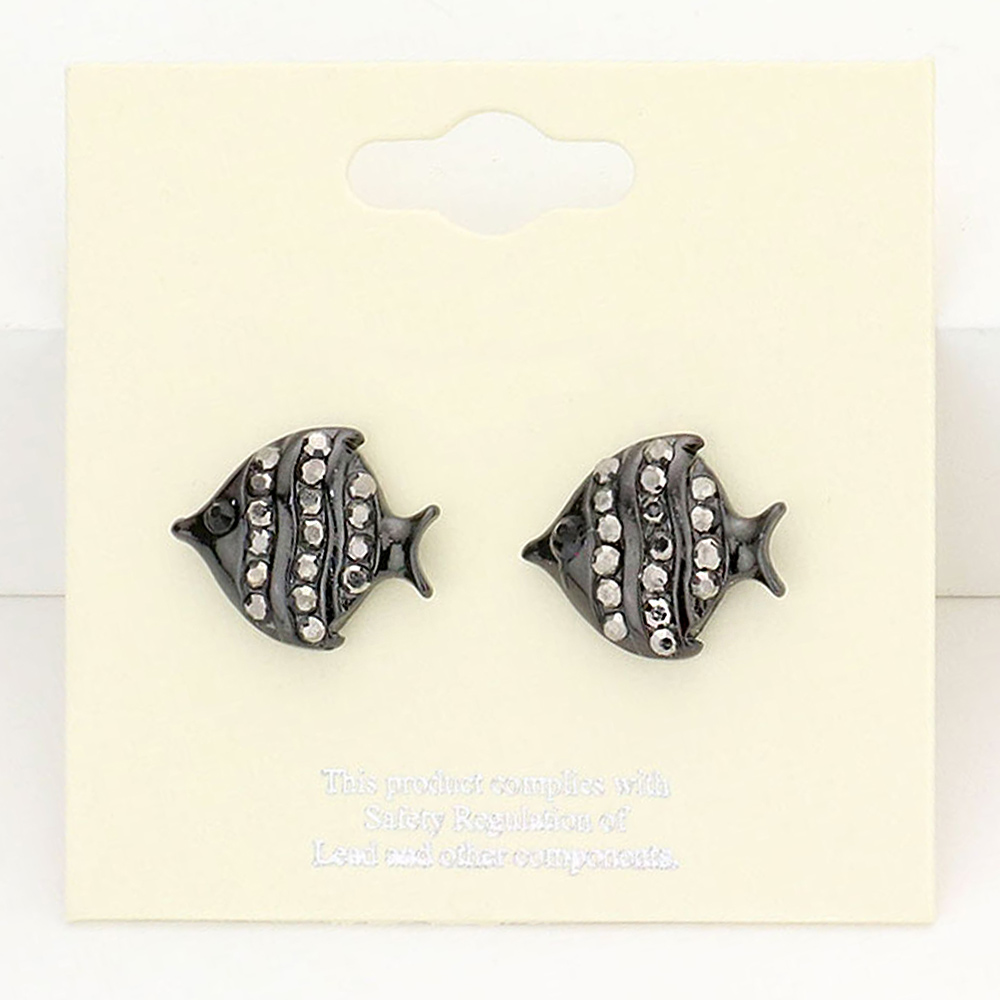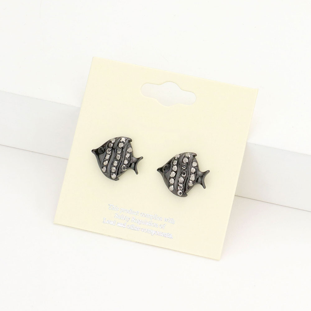 Details • Size : 0.5" X 0.6" • Post Back • These fish crystal stud earrings add a touch of ocean-inspired charm and sparkle to your look. Featuring a playful fish design adorned with glimmering stones, they bring a blend of elegance and whimsy, perfect for expressing your unique style with a fun, polished flair. • Lead and Nickel Compliant