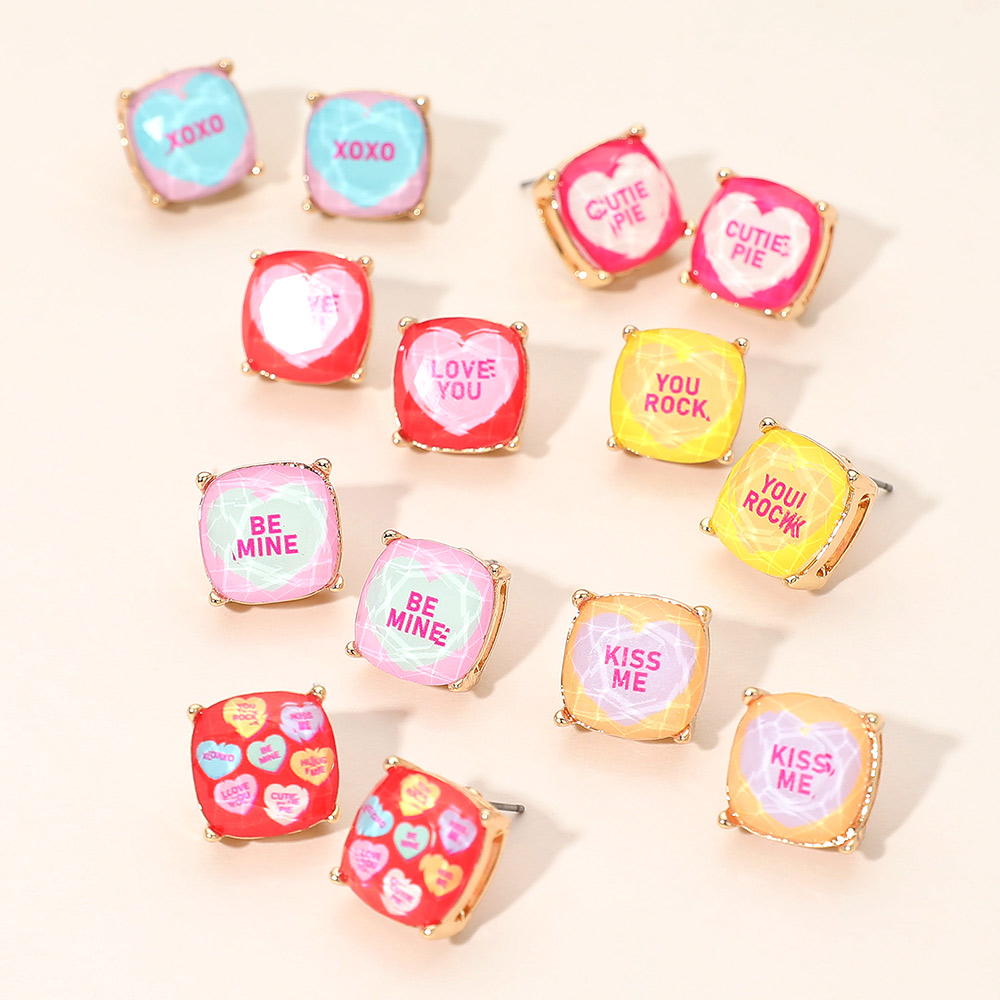 LOVE YOU Message Heart Square Cushion Stud Earrings