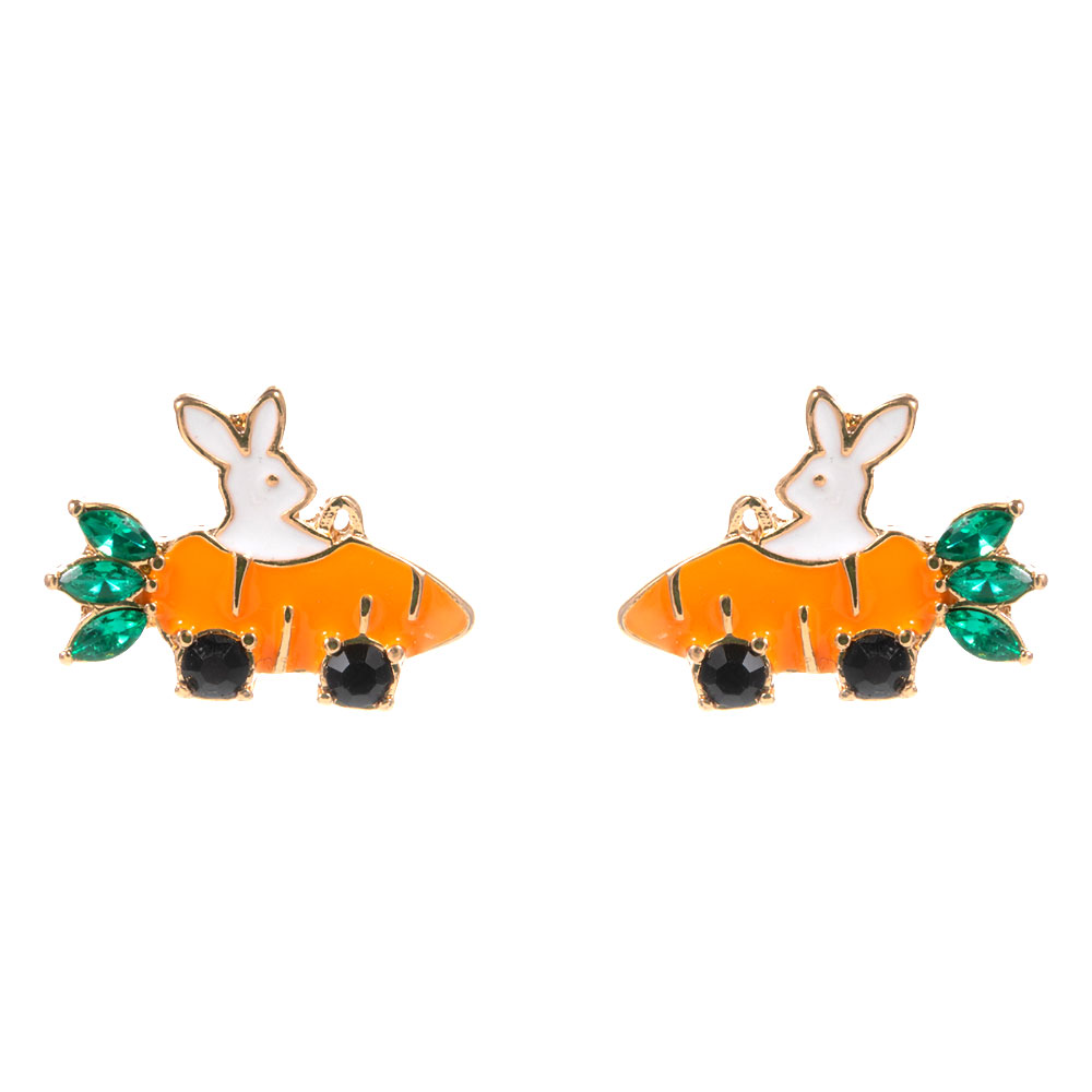 Details • Size : 0.8" X 0.6" • Titanium Post Back • Playful bunny and carrot stud earrings featuring a charming animal motif with sparkling accents. Ideal for Easter collections, spring gift shops, novelty jewelry displays, and seasonal promotions. A fun, lightweight design that adds a cheerful touch to everyday and holiday looks. • Hypoallergenic • Lead and Nickel Compliant