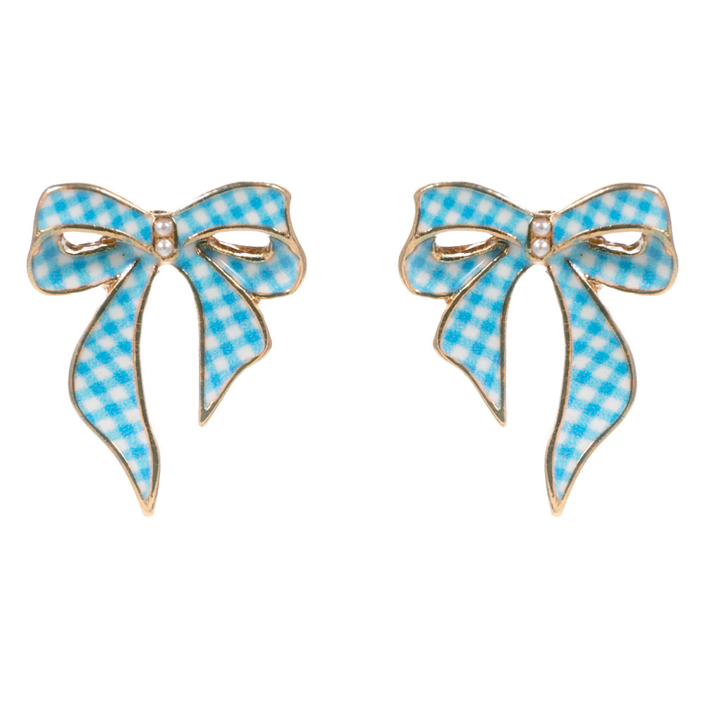 Details • Size : 0.7" X 0.8" • Titanium Post Back • Charming bow-shaped stud earrings featuring a delicate patterned design with graceful ribbon tails and subtle accent details. A feminine, playful style that adds a sweet touch to everyday looks, boutique collections, seasonal assortments, and gift-ready accessory displays while remaining easy to wear and versatile. • Hypoallergenic • Lead and Nickel Compliant