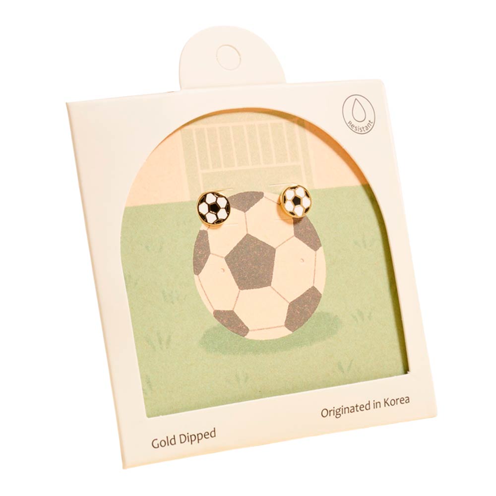 Details • Size : 0.3" X 0.3" • Post Back • Soccer ball stud earrings designed for sports lovers and everyday wear. These playful studs add a sporty accent to game day outfits, team events, and casual styles. A great gift option for soccer fans, youth sports collections, and seasonal novelty jewelry displays. • Gold Dipped • Hypoallergenic • Made In Korea