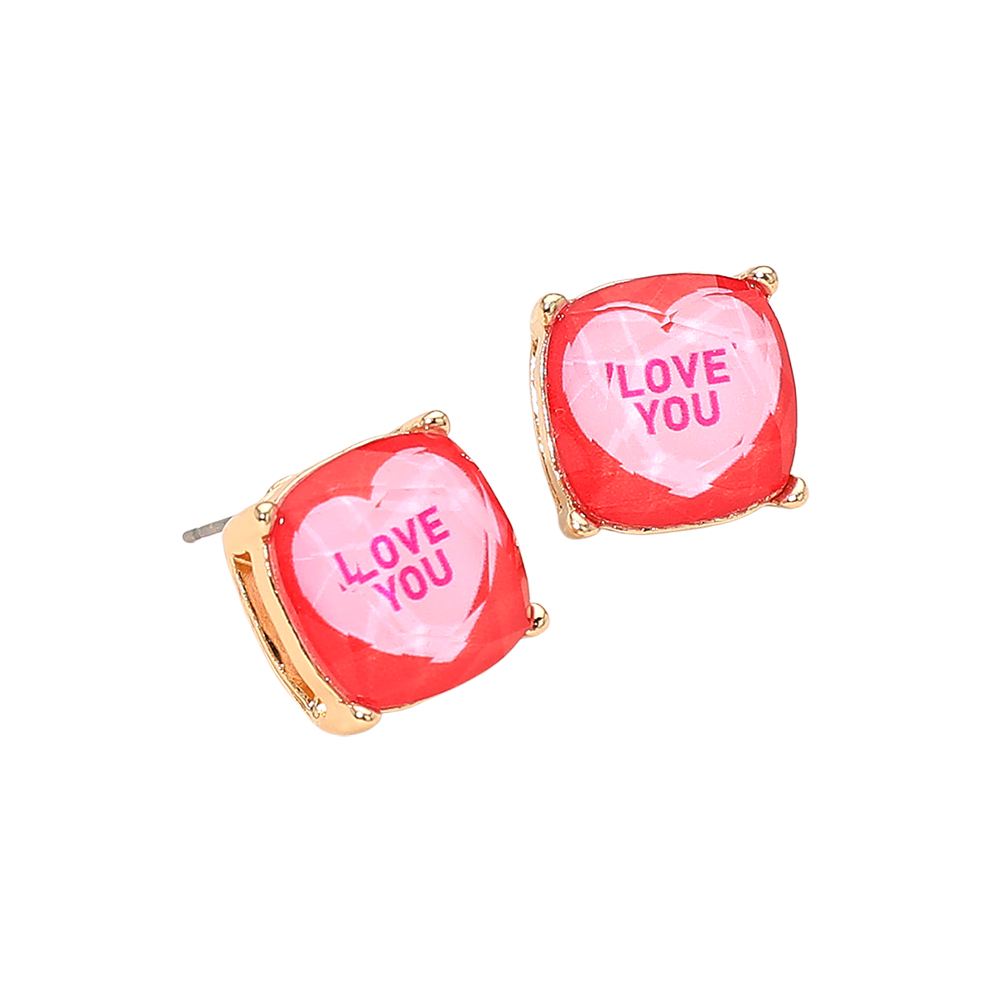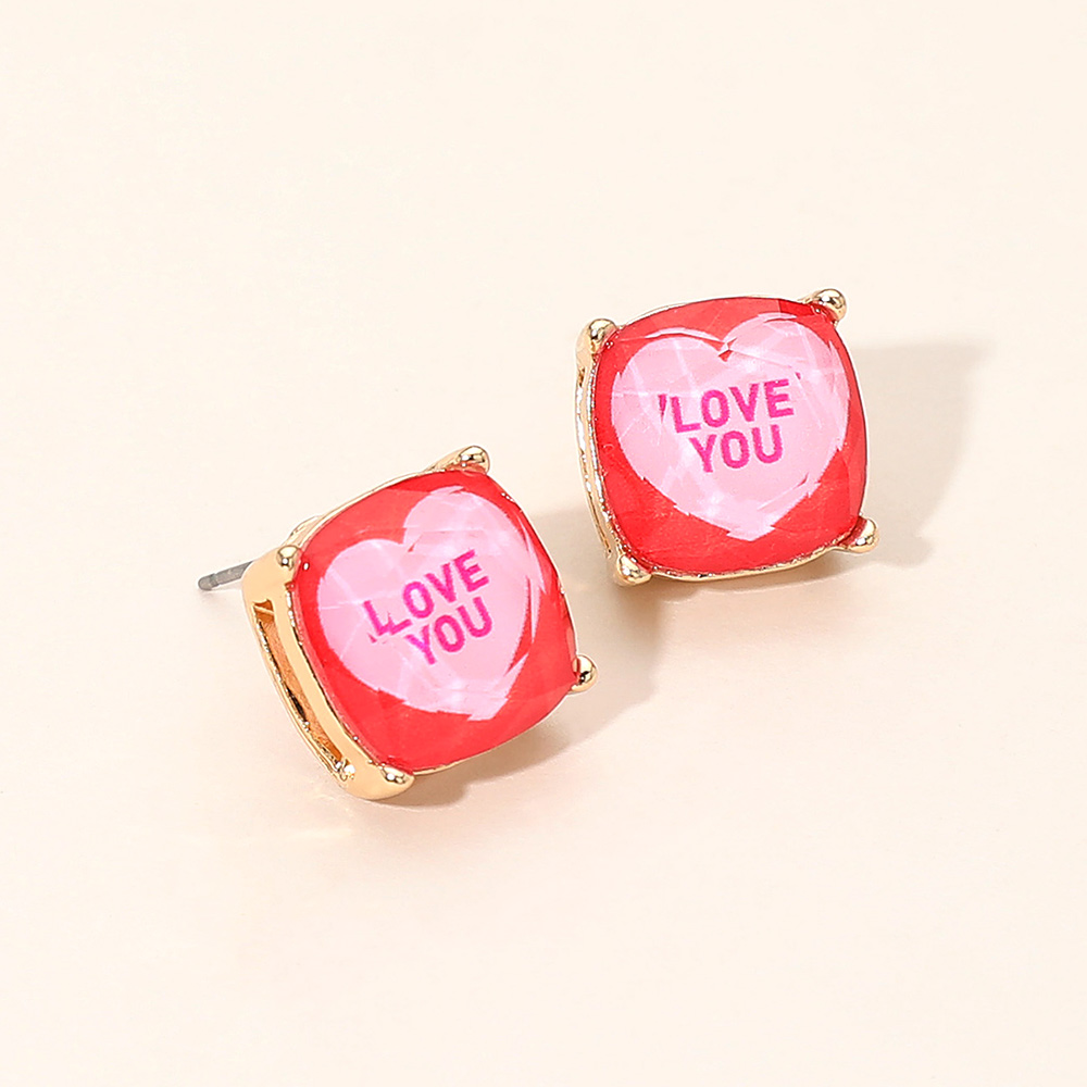 Details • Size : 0.5" X 0.5" • Post Back • Fun stud earrings featuring a bold “LOVE YOU” message with a faceted design for a playful statement look. Lightweight and easy to wear, perfect for adding personality to everyday outfits, casual looks, or gifting with an uplifting and cheerful touch. • Lead and Nickel Compliant