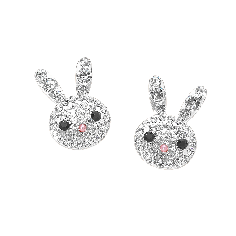 Details • Size : 0.7" X 1" • Post Back • Charming bunny stud earrings featuring a playful animal face silhouette with sparkling accents that catch the light beautifully. Designed to add a cute yet eye-catching touch to everyday looks, themed outfits, gift assortments, and novelty jewelry collections. • Hypoallergenic • Lead and Nickel Compliant