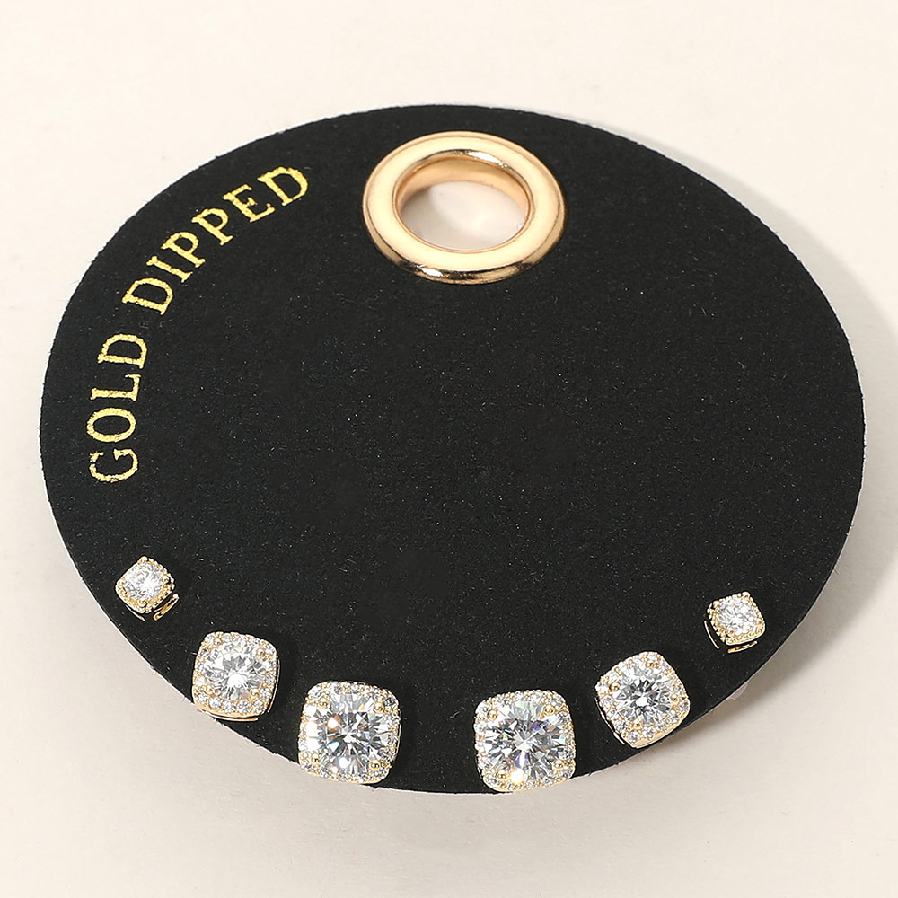 Details • Size : 0.1" - 0.3" L • Post Back • This elegant stud earring set features multiple cushion cut designs in graduated sizes, perfect for everyday wear or special occasions. Designed for comfortable all day use, these versatile studs are ideal for mixing, matching, gifting, or adding refined sparkle to boutique accessory collections. • Gold Dipped