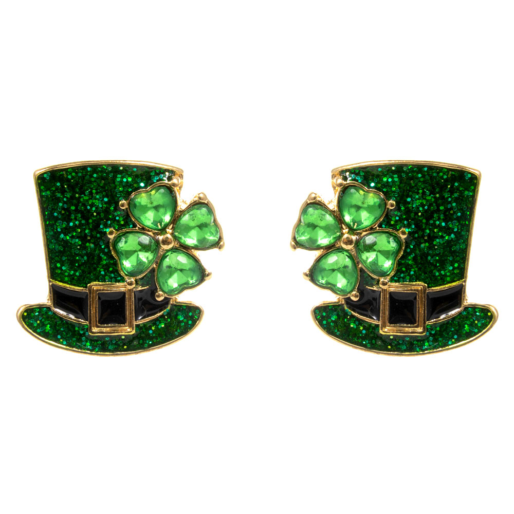 Details • Size : 0.75" X 0.75" • Titanium Post Back • Festive stud earrings featuring a playful top hat design accented with a shamrock motif and faceted detailing. Ideal for seasonal promotions, themed celebrations, and novelty accessory displays, this bold yet compact style adds charm, personality, and eye-catching appeal to any assortment. • Hypoallergenic • Lead and Nickel Compliant