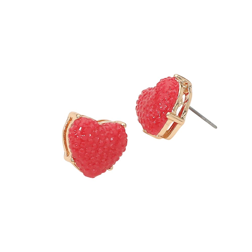 • Playful heart stud earrings featuring a raised textured surface that adds dimension and sparkle to a classic silhouette. Designed in a compact stud style for comfortable all day wear, these earrings make a charming statement for gift shops, seasonal collections, boutiques, and everyday fashion looks with a fun, romantic touch.