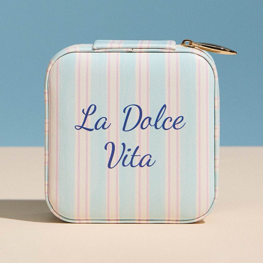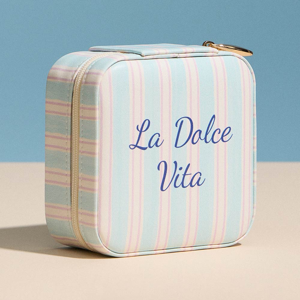 Details • Size : 3.5" X 3.5" X 2" • Zipper Closure • Stylish mini zip pouch featuring a charming “La Dolce Vita” design, perfect for organizing small essentials on the go. Ideal for travel, handbags, or gifting, this compact case keeps jewelry, coins, and daily accessories neatly stored with a fun, lifestyle-inspired touch.