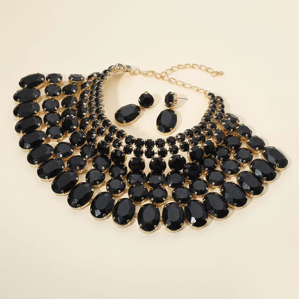 Details • Necklace Size: 13" + 4" L • Decor Size: 3.7" L • Earring Size: 1.75" L • Dramatic bib necklace and earring set featuring layered oval stones arranged in a bold cascading design. Perfect for weddings, galas, performances or any occasion that calls for standout glamour. An eye-catching accessory set that elevates formal and evening looks.