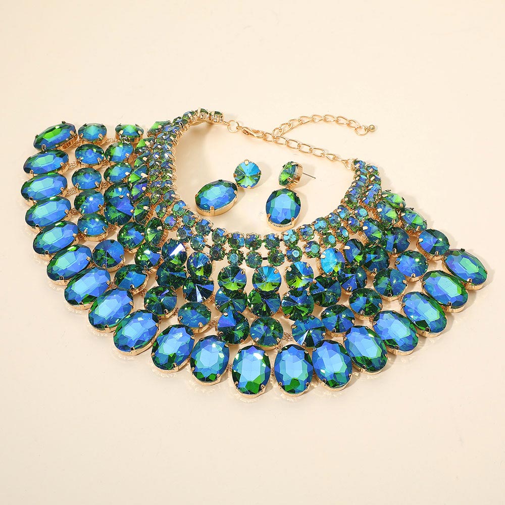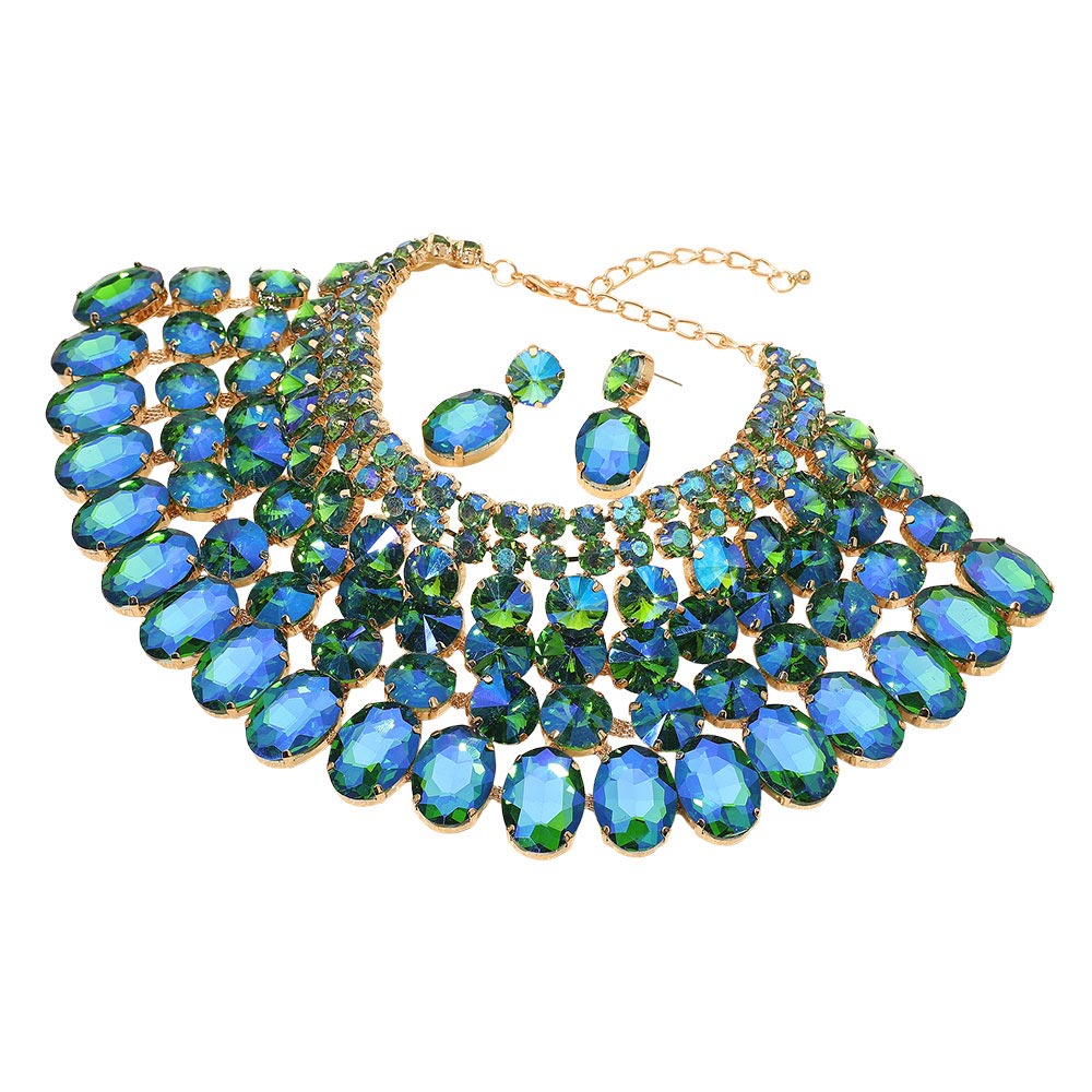 Details • Necklace Size: 13" + 4" L • Decor Size: 3.7" L • Earring Size: 1.75" L • Dramatic bib necklace and earring set featuring layered oval stones arranged in a bold cascading design. Perfect for weddings, galas, performances or any occasion that calls for standout glamour. An eye-catching accessory set that elevates formal and evening looks.