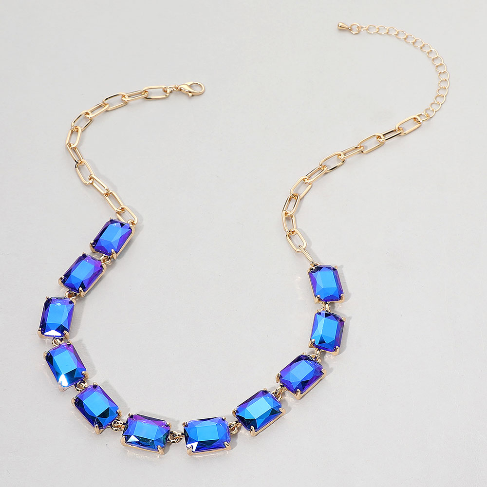 Details • Necklace Size : 16" + 2.5" L • Decor Size : 0.4" L • This elegant gemstone chain necklace features a row of precisely cut stones linked with a sleek chain for a refined, modern look. Its adjustable closure ensures a comfortable fit, making it a sophisticated accessory for formal occasions, evening wear, or adding a statement touch to everyday style. • Lead and Nickel Compliant