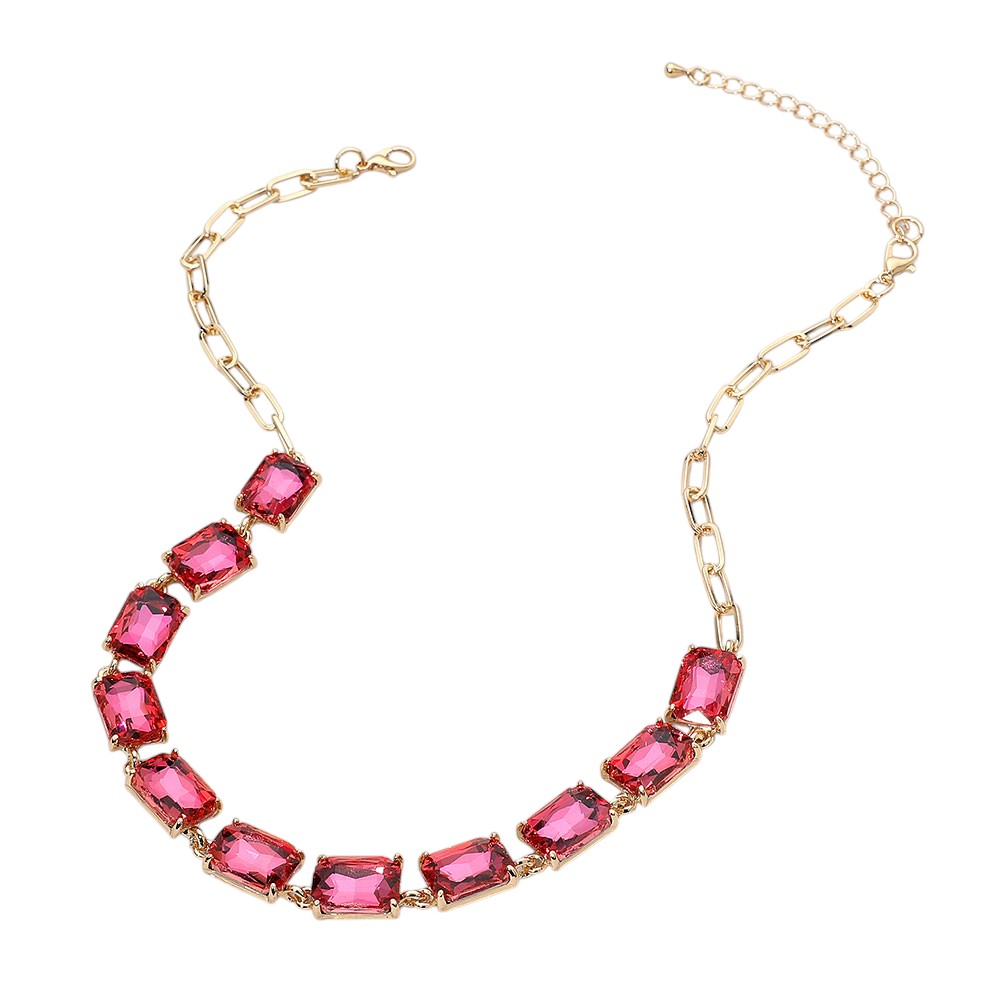 • This elegant gemstone chain necklace features a row of precisely cut stones linked with a sleek chain for a refined, modern look. Its adjustable closure ensures a comfortable fit, making it a sophisticated accessory for formal occasions, evening wear, or adding a statement touch to everyday style.