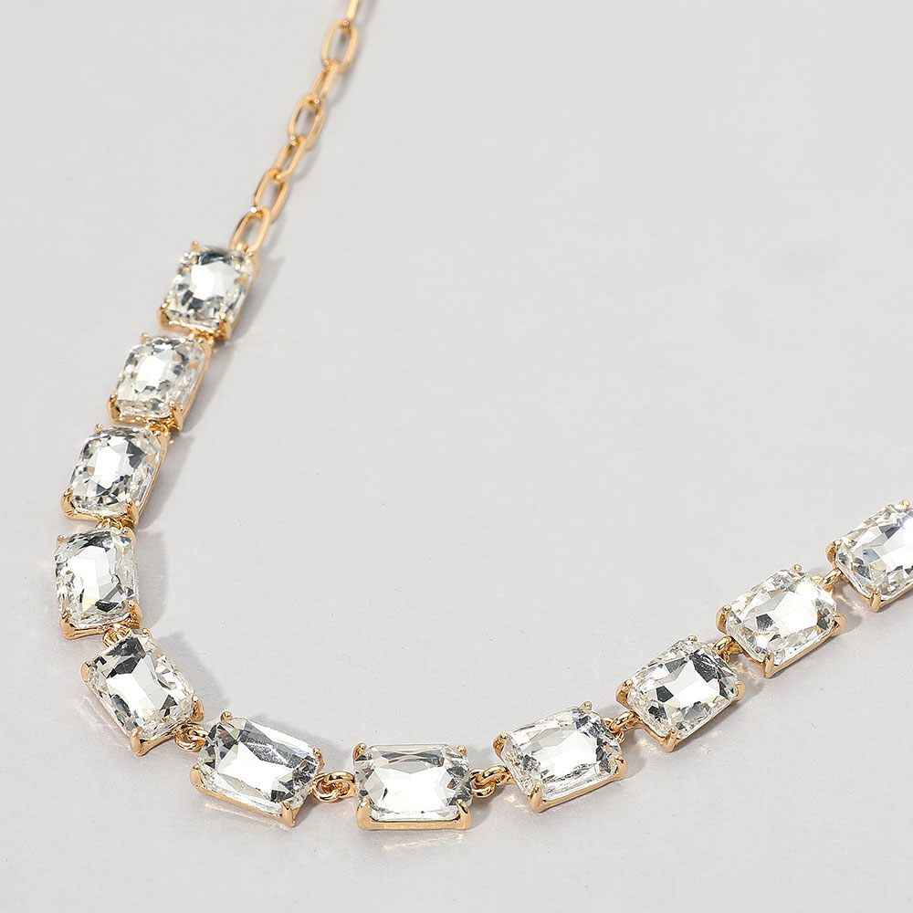 • This elegant gemstone chain necklace features a row of precisely cut stones linked with a sleek chain for a refined, modern look. Its adjustable closure ensures a comfortable fit, making it a sophisticated accessory for formal occasions, evening wear, or adding a statement touch to everyday style.