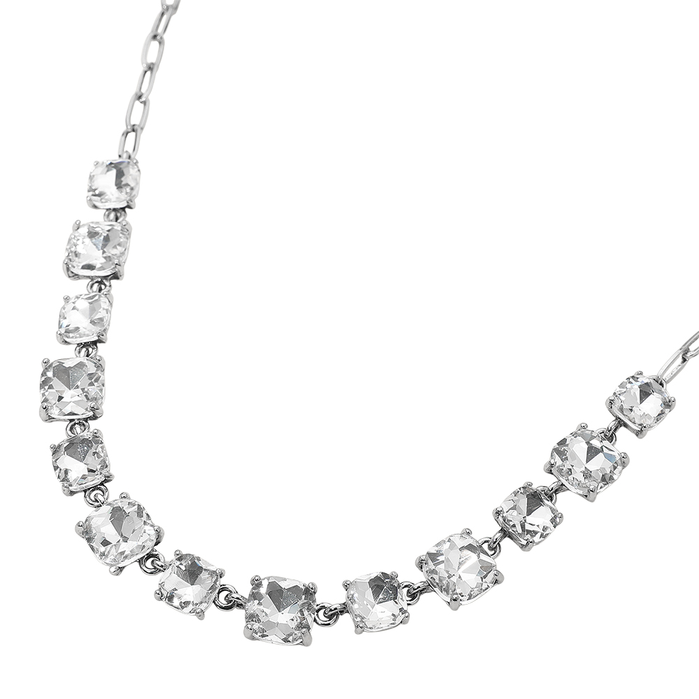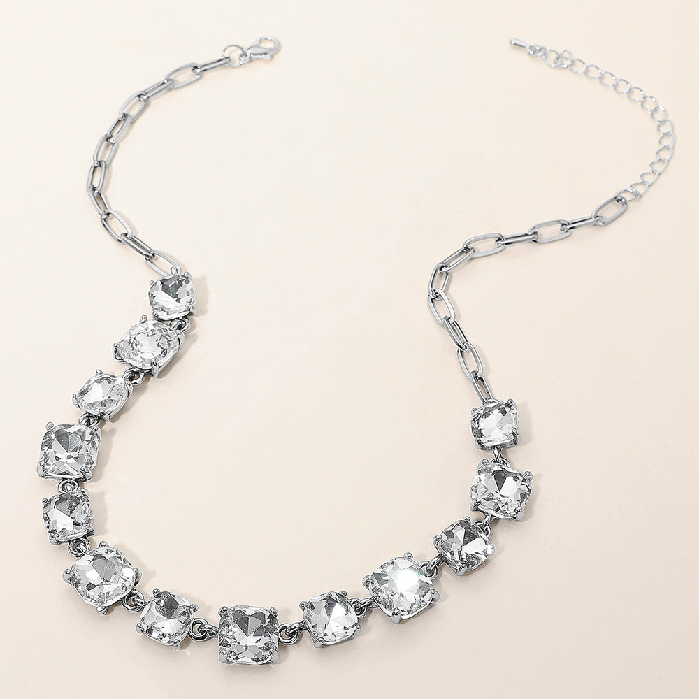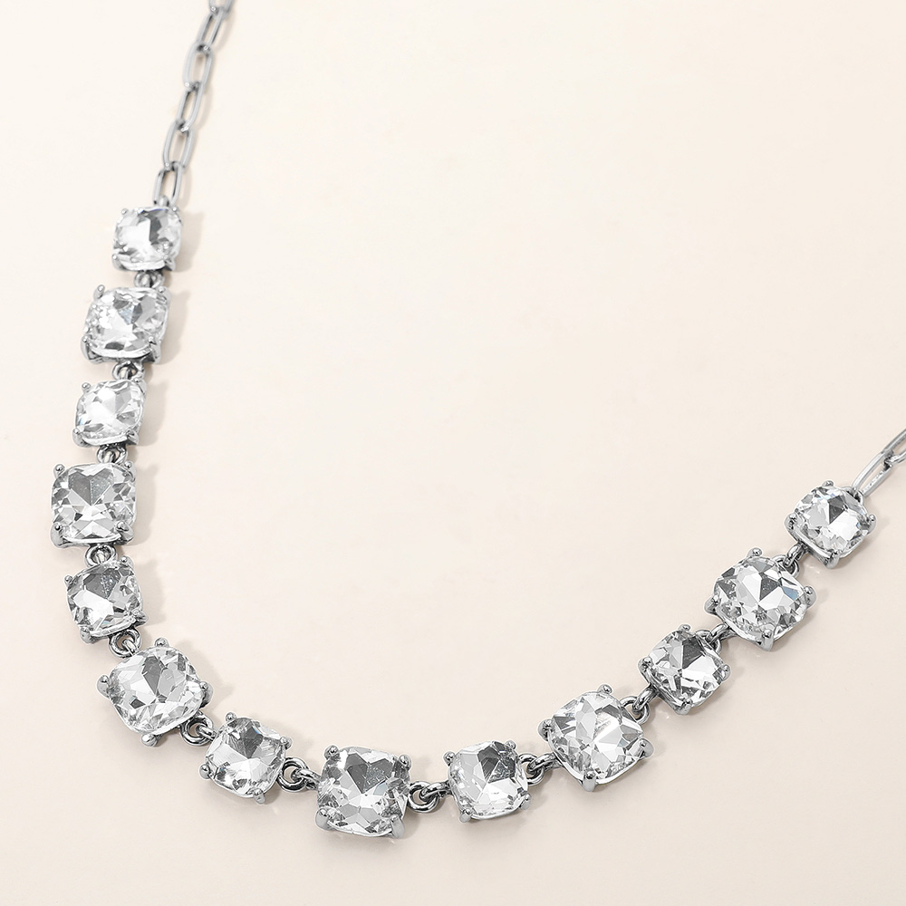 Details • Necklace Size : 16" + 2.75" L • Decor Size : 0.5" L • Elevate your style with this stunning square cut gemstone statement necklace. Featuring shimmering faceted stones linked in a classic design, it offers a chic adjustable fit. Perfect for evening wear, weddings, parties, or adding a sophisticated sparkle to your everyday look. • Lead and Nickel Compliant