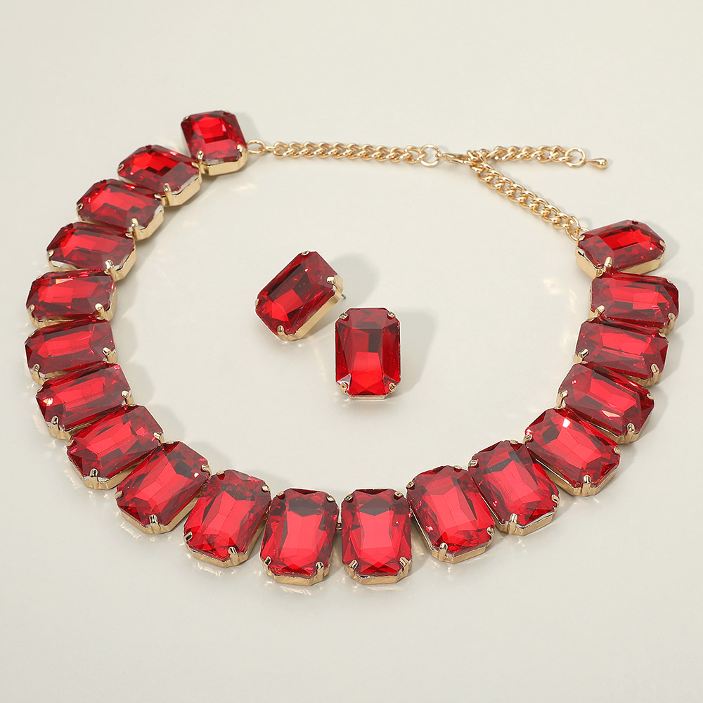 Details • Necklace Size : 16.5" + 3.25" L • Decor Size : 1" L • Earring Size : 1" L • Striking necklace and earring set featuring rectangular stones arranged in a clean, modern silhouette. Perfect for formal events, performances or adding standout shine to evening outfits. A bold statement accessory set that elevates any look with sleek, eye-catching style. • Lead and Nickel Compliant
