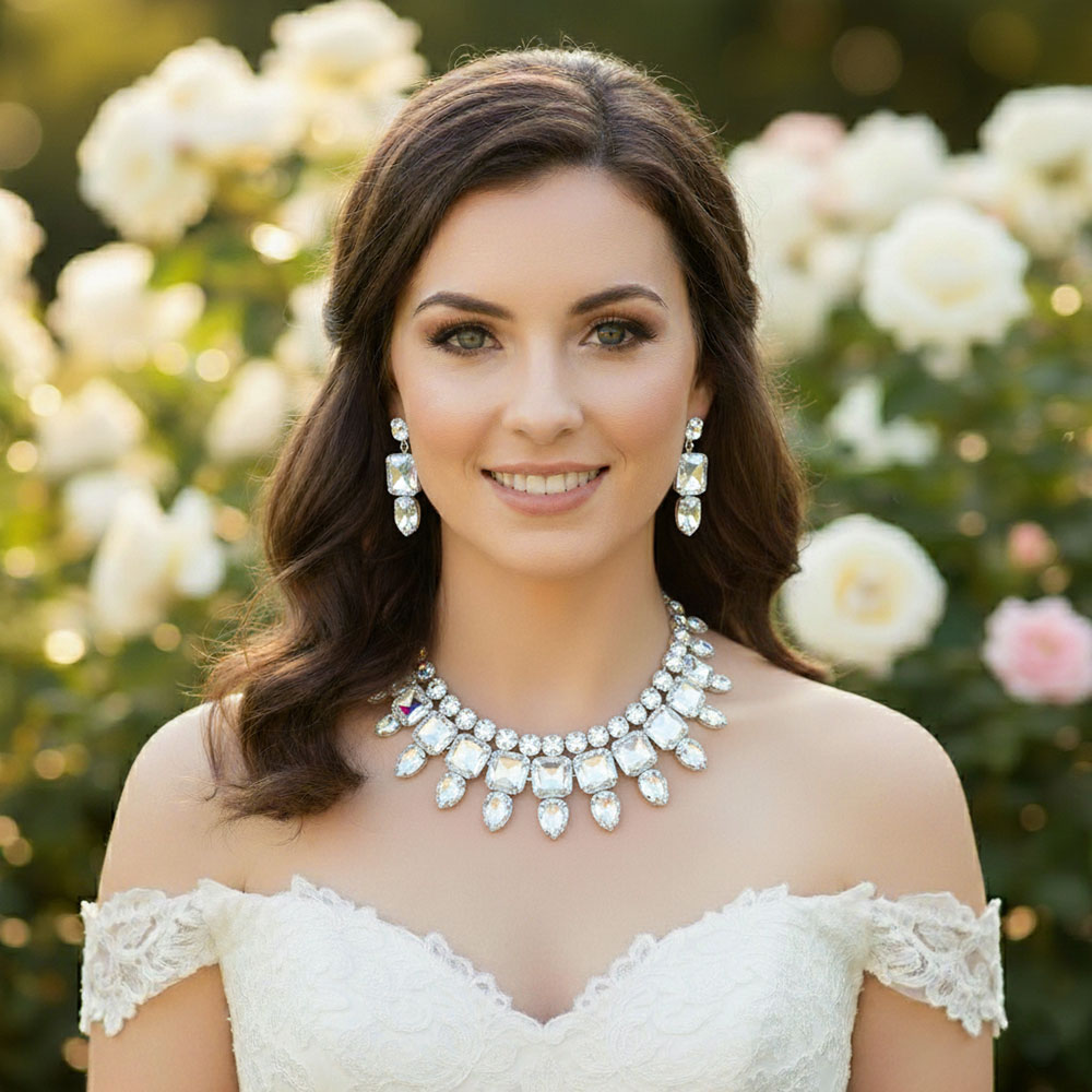 • Stunning statement jewelry set featuring a dramatic necklace and matching earrings adorned with large gemstones. Perfect for special occasions, parties, or evening events, adding glamour and sophistication to any outfit. A show-stopping accessory for an elegant, confident look.