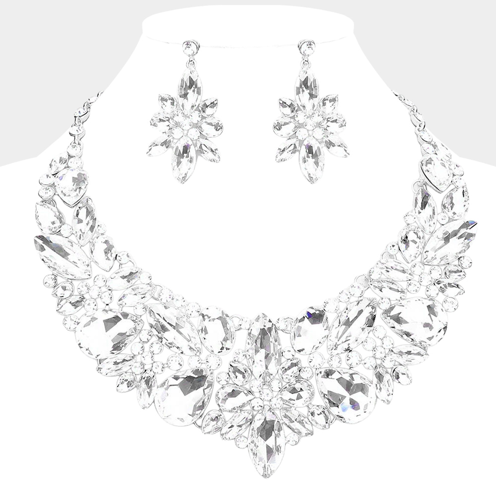 Details • Necklace Size : 17" + 3" L • Decor Size : 2.4" L • Earring Size : 2" L • Dazzle in timeless elegance with this rhinestone statement necklace and earring set. Featuring bold clustered crystals in a floral-inspired design, this matching set is perfect for weddings, galas, and special occasions. The adjustable necklace ensures a comfortable fit, while the lightweight earrings add just the right amount of sparkle. A must-have for bridal looks, evening wear, or anyone wanting to make a glamorous entrance.
