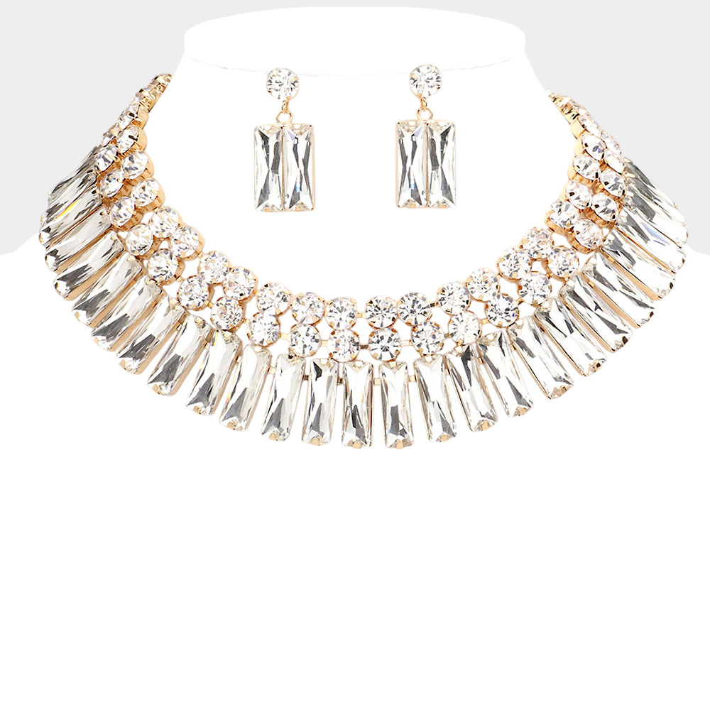 • Shine from every angle with this iridescent rhinestone statement necklace and matching earrings. Featuring radiant rectangular crystals paired with shimmering round stones, this bold set reflects rainbow hues for a dazzling finish. Perfect for stage, pageants, parties, and special occasions, this design instantly elevates any evening or event look. Lightweight yet striking, it’s a go-to accessory for making a glamorous entrance.