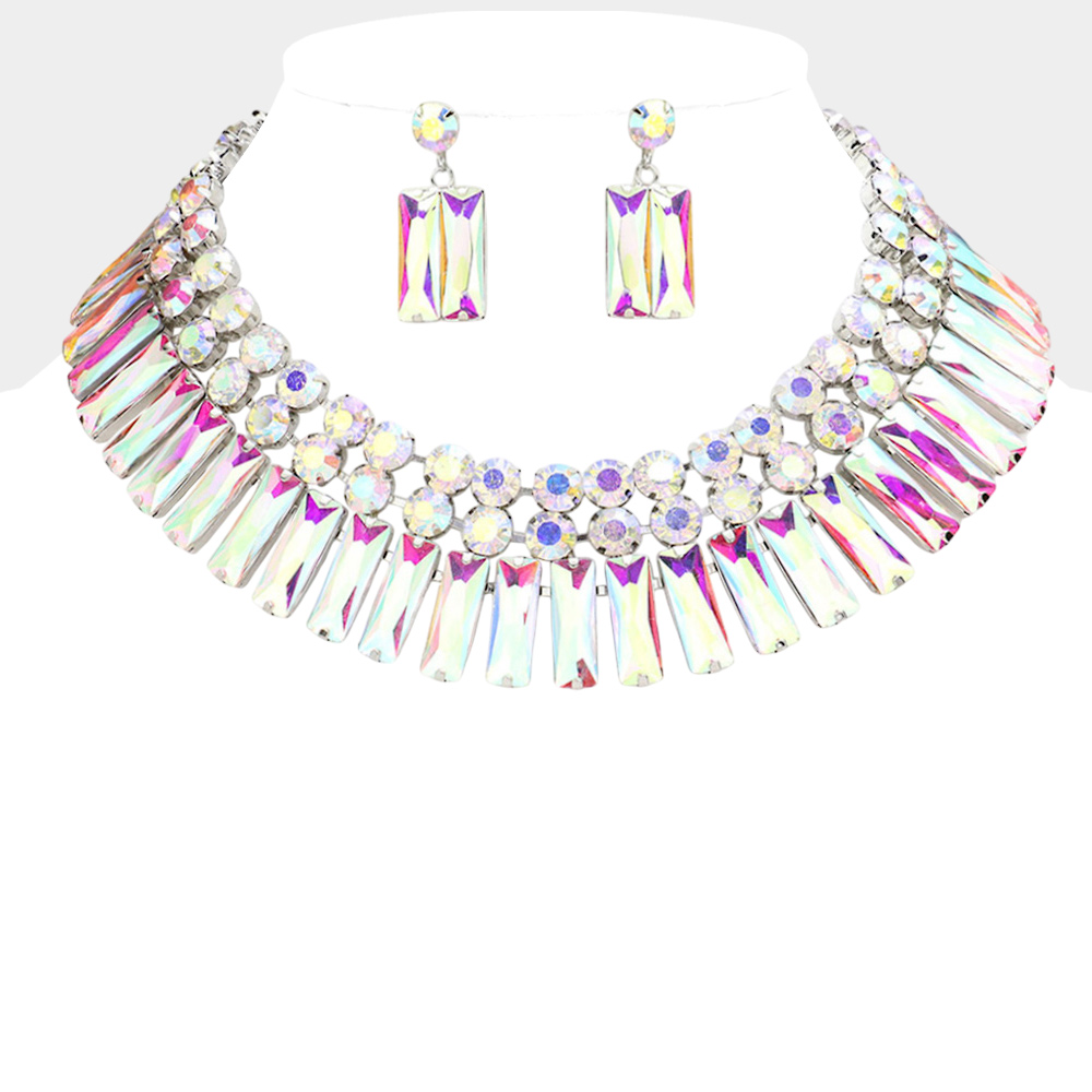 Details • Necklace Size : 16" + 4.5" L • Decor Size : 1.5" L • Earring Size : 1.5" L • Shine from every angle with this iridescent rhinestone statement necklace and matching earrings. Featuring radiant rectangular crystals paired with shimmering round stones, this bold set reflects rainbow hues for a dazzling finish. Perfect for stage, pageants, parties, and special occasions, this design instantly elevates any evening or event look. Lightweight yet striking, it’s a go-to accessory for making a glamorous entrance.