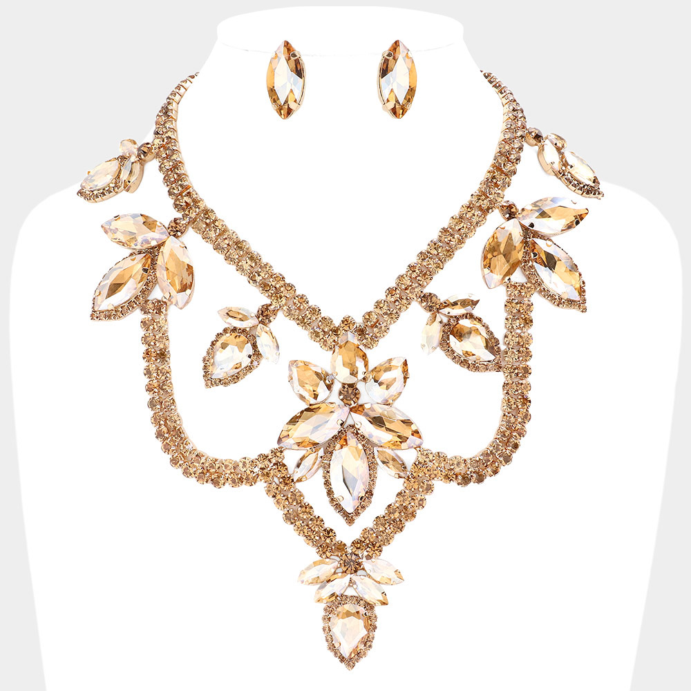 Details • Necklace Size : 15.5" + 7" L • Decor Size : 5" L • Earring Size : 1" L • Elegant statement bib necklace and earring set featuring sparkling crystal leaf clusters and layered detailing for a glamorous, eye-catching finish. Perfect for evening events, formals, weddings, and special occasions, adding radiant shine and dramatic sophistication to any standout look.