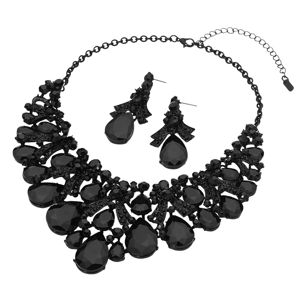 Details • Necklace Size : 18" + 3" L • Decor Size : 2.75" L • Earrings Size : 2.5" L • Make an unforgettable impression with this statement teardrop bib necklace and earring set. Adorned with an array of dazzling stones and intricate detailing, this bold jewelry set adds luxurious sparkle and sophistication—perfect for weddings, galas, and evening events. • Lead and Nickel Compliant