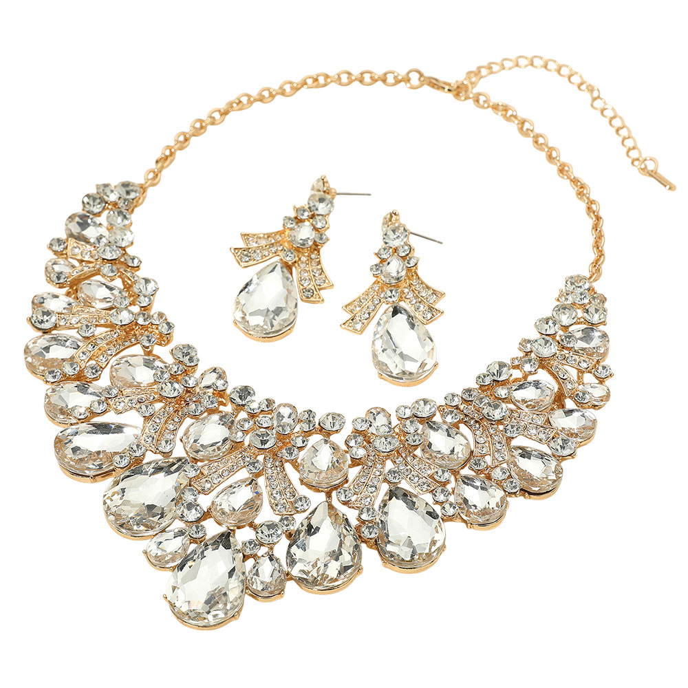 • Make an unforgettable impression with this statement teardrop bib necklace and earring set. Adorned with an array of dazzling stones and intricate detailing, this bold jewelry set adds luxurious sparkle and sophistication—perfect for weddings, galas, and evening events.
