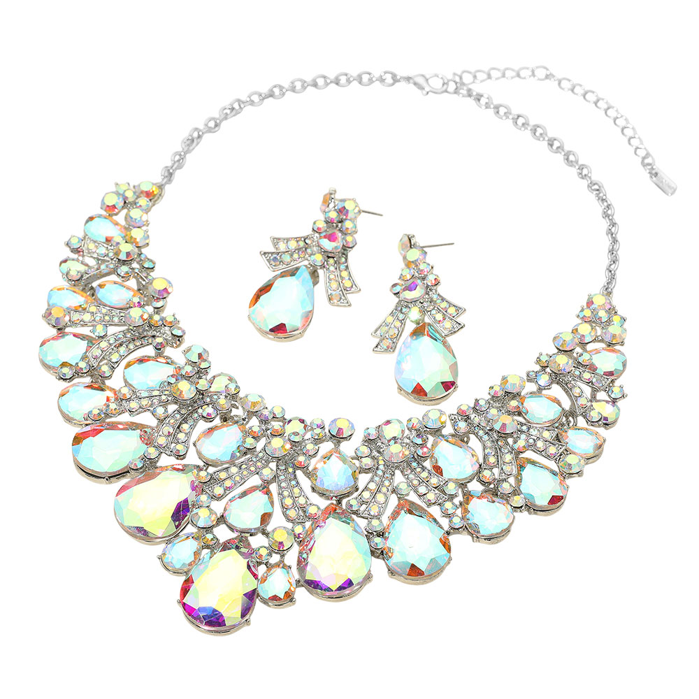 Details • Necklace Size : 18" + 3" L • Decor Size : 2.75" L • Earrings Size : 2.5" L • Make an unforgettable impression with this statement teardrop bib necklace and earring set. Adorned with an array of dazzling stones and intricate detailing, this bold jewelry set adds luxurious sparkle and sophistication—perfect for weddings, galas, and evening events. • Lead and Nickel Compliant